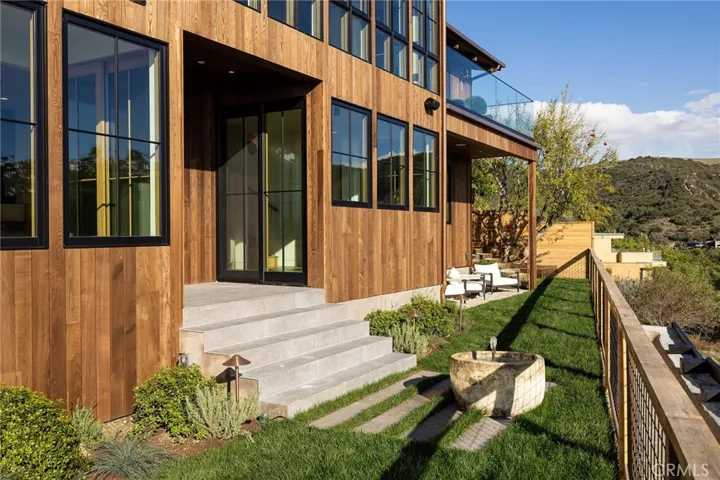 Outdoor access continues with a spacious lower grass yard featuring a stone fountain, outdoor shower, flagstone, copper accents, and three private sitting retreats—each capturing peaceful ocean and hillside vistas. The oversized driveway accommodates four cars, while the two-car garage includes an EV charger and potential for an ADU.