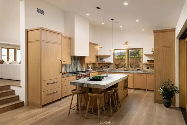Glassed entry doors open to an elevated great room ideal for ocean-view lounging, dining, and taking in sunset tranquility over Catalina Island. The professional chef’s kitchen features a striking quartzite fusion island, Sub-Zero wood-clad refrigerator, 48″ Wolf range, and inset white-oak cabinetry. Fifteen-foot La Cantina doors connect seamlessly to an expansive courtyard with al fresco dining, BBQ center, flagstone paths, fountain, specimen trees, private alcoves, and lush professional landscaping—indoor-outdoor living at its finest.