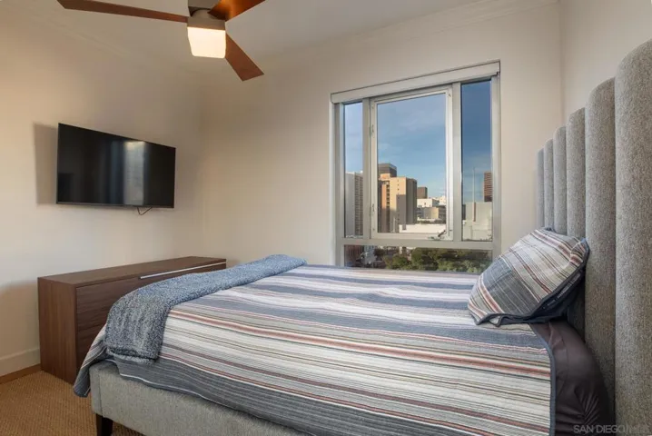 This rare home, filled with natural light, is exquisitely upgraded and remodeled. It’s a spacious 2-bedroom, 2-bath condo in the heart of the Gaslamp. This unit has it all: sweeping city views, wood flooring throughout, quartz counters, stainless steel appliances, in-unit washer and dryer, 2 secured parking spaces, and much more. The prime location is within walking distance to endless dining options, entertainment, and nightlife. Building amenities include a pool, spa, courtyard, BBQ, community room, and fitness center—perfect for those seeking to immerse themselves in urban living.