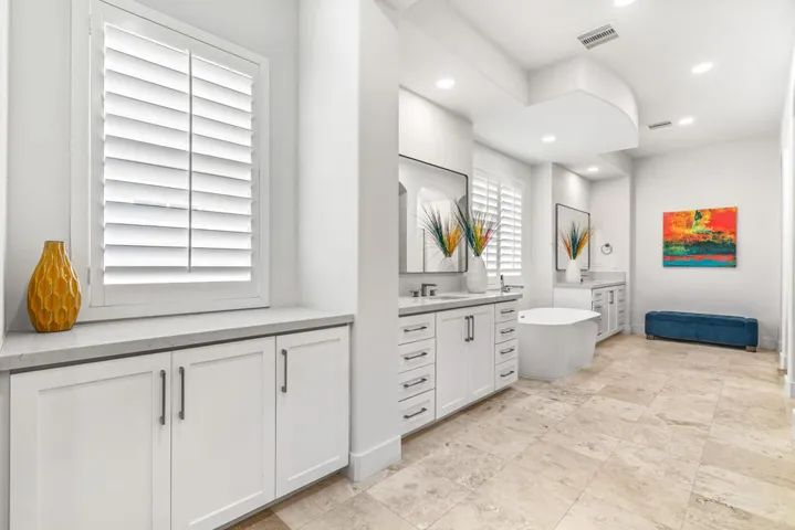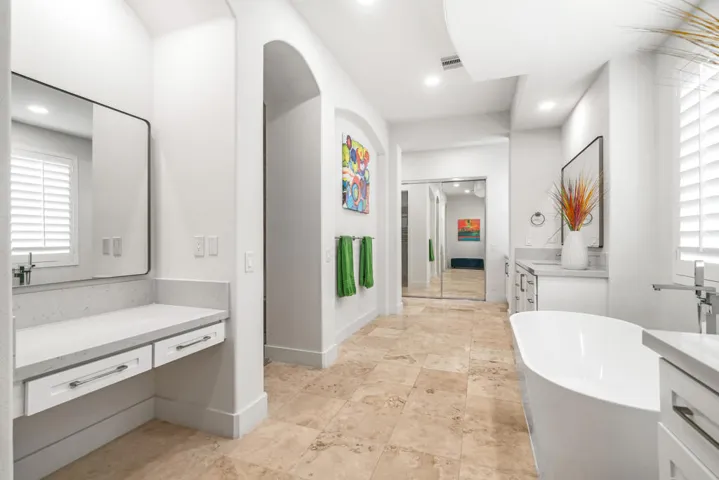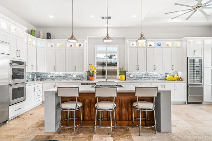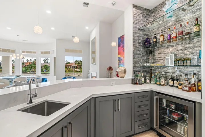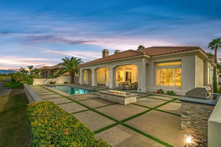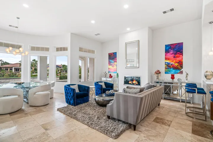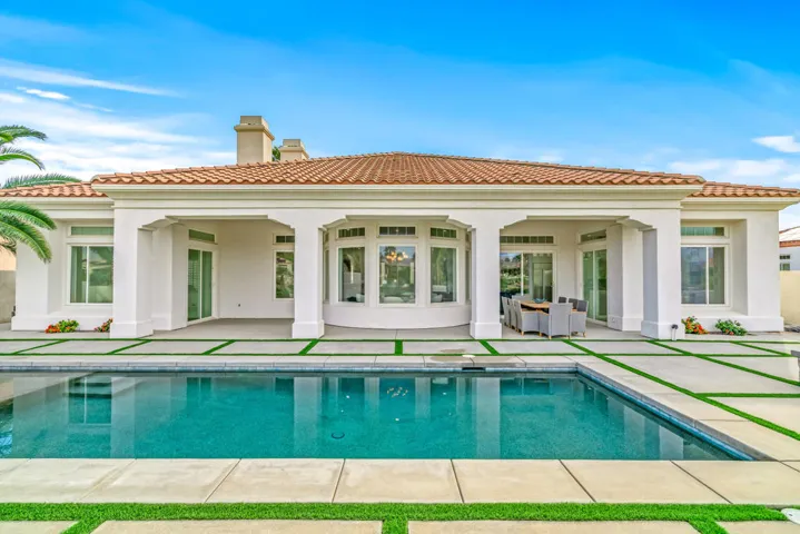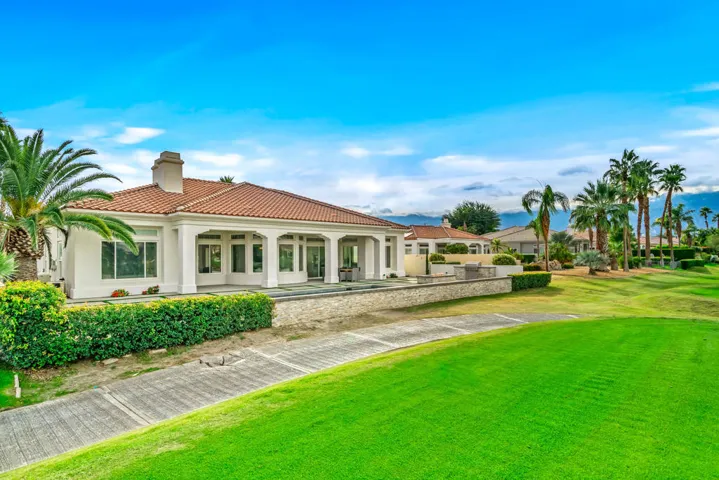 WARM CONTEMPORARY GRANDEUR IN PRESTIGIOUS MIRA VISTA! Experience magnificent Desert living in this 4369 Sq Ft modern residence perfectly poised on a premium elevated Lot, within the guard gated community of Mira Vista, in Rancho Mirage. This opulent FURNISHED home blends plush comfort, refined modernity and exceptional privacy; All overlooking the 11th Fairway with breathtaking MOUNTAIN, WATER and GOLF COURSE VIEWS! A grand sense of arrival begins in a vast rotunda, where natural light pours into expansive living areas that exude true elegance. The formal living and dining spaces transition effortlessly into the inviting family room creating, harmony, warmth and an ideal backdrop for both intimate gatherings and grand scale entertaining Freshly added lighting, ceiling fans, upgraded doors, fixtures and cabinetry, completed by extra wide base boards heighten the home’s rich character. The chef’s kitchen is a stunning blend of form and function, thoughtfully updated with quartz counter tops, custom backsplash, a lighted display niche and spacious walk in pantry. A large scale refrigerator, GE gas cooktop, additional Dacor appliances and oversized wine refrigerator with cooling drawers, elevate the culinary experience. Nearby, a sophisticated wet bar with glass shelving, bar refrigerator and seating for guests enhance the home’s capacity for sumptuous entertaining! The private quarters are equally impressive. The palatial primary suite offers a serene retreat with a cozy fireplace, sitting area with private entry to the backyard. The primary bathroom provides a Zen-style setting with dual sinks, separate vanities, tub and large shower completed by two enormous walk in closets. Nicely appointed are two guest ensuites surrounding and additional media room and an additional bedroom that serves beautifully as a guest room or office. An attached casita with private entry, is a thoughtful haven for guests, extended stays, or multigenerational living. OUTDOORS enjoy a freshly curated backyard, with pool, spa, built in cook station and firepit for evenings under the stars with uninterrupted fairway views! Not to be forgotten is the separate laundry room two car garage and dedicated golf cart garage. Residents in Mira Vista enjoy Tennis, Pickleball and Golf and beautifully manicured grounds. MODERN, ELEGANT AND UNDENIABLY COOL A LIFESTLE REDEFINED!