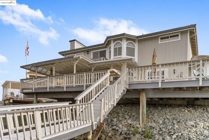 Stunning waterfront home on a rare point lot in Discovery Bay with 2 cover U docks with hoists and extra water access and beautiful Mount Diablo views. This meticulously maintained 4 bed, 3 bath property features an inviting grassy entry and a grand curved staircase entrance, with an open downstairs floor plan ideal for entertaining. Enjoy a spacious kitchen with large island, formal dining room, the family room includes a wet bar and is perfect for hosting large gatherings for summer fun or holidays. Home includes a convenient downstairs bedroom with Murphy bed and full bath with exterior access for easy cleanup after enjoying the Delta. Upstairs offers large bedrooms, a Jack-and-Jill bath, and a luxurious primary suite with private balcony, fireplace, and a spa-style jetted tub to enjoy while watching the spectacular sunset. This home comes with Solar that is paid off. It also includes a large indoor laundry room with chute for convenience. Nearly every window captures water or sky. Located in a quiet court within the desirable Discovery Bay water community, this home offers comfort, elegance, and the perfect Delta lifestyle. It really has it all and is A must see property! Don’t miss the chance to experience true delta living.