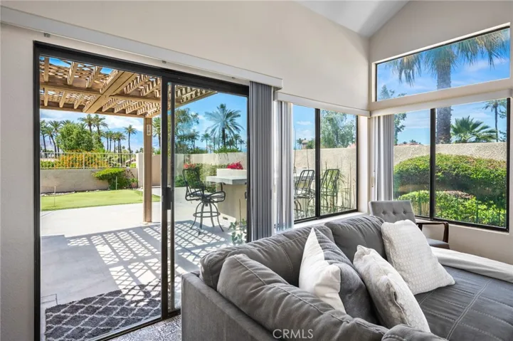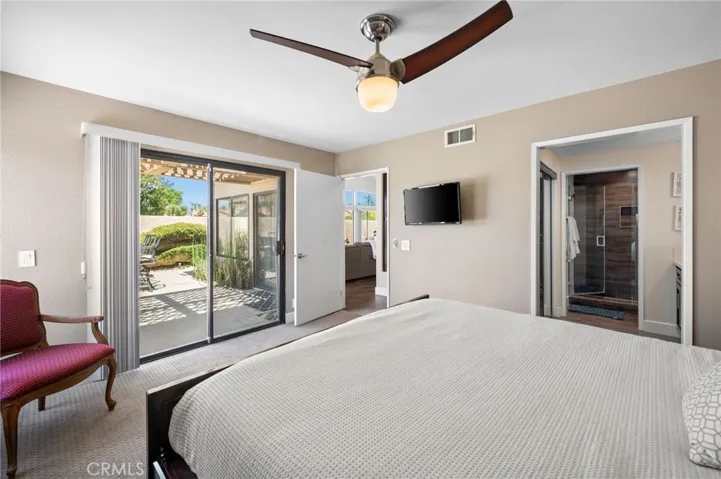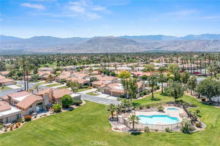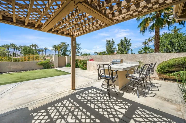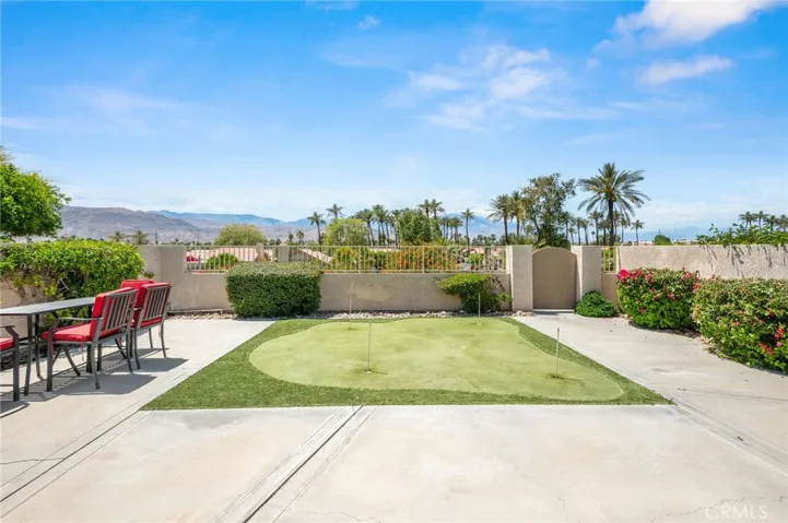Premier Corner Lot in Guard-Gated Silver Sands! This is a rare opportunity to own one of the most desirable lots in the prestigious Silver Sands community. This beautifully upgraded single-level G-plan home sits on a premium corner lot, offering one of the few private yards in the development with unparalleled mountain views and direct access to two pools and spas just steps away. Featuring two spacious en-suite primary bedrooms, this highly sought-after floor plan boasts soaring ceilings and a completely open layout filled with natural light. The interiors have been tastefully reimagined with contemporary flair, including wood-look tile flooring, fresh bright paint, and stylish metallic tile accents. The chef’s kitchen is open to the living and dining areas and showcases modern walnut-toned cabinetry, white quartz countertops, custom backsplash, stainless steel appliances, and a raised breakfast bar. The great room is surrounded by windows and anchored by a cozy fireplace—perfect for cool desert evenings. Both primary suites offer upgraded bathrooms with quartz counters, walk-in showers with wood-look tile surrounds, and generous walk-in closets. What truly sets this home apart is the expansive private yard—a rare find in Silver Sands. Ideal for entertaining or relaxing, it features: Multiple patio areas for al fresco dining, Built-in BBQ with bar seating, Fire feature for ambiance, A putting green for added fun, Direct gated access to two nearby pools and spas. This fully furnished move-in-ready gem combines luxury, privacy, and unbeatable location within one of the desert’s most coveted guard-gated communities. The SILVER SANDS RACQUET CLUB is a gated community with 256 homes…located adjacent to the J.W. Marriott Desert Springs Resort and across from Desert Willow Golf Resort where Palm Desert homeowners can play for reduced rates. The complex features club house for social activities, 7 lighted tennis courts, 4 pickleball courts, tennis and pickleball pros on staff in season: fitness center and 15 pools/spas which are all included in the HOA dues. HOA dues also include roof, exterior maintenance, cable TV, internet, tennis, pickleball, trash removal and security. Silver Sands Racquet Club has everything to make everyday a vacation!