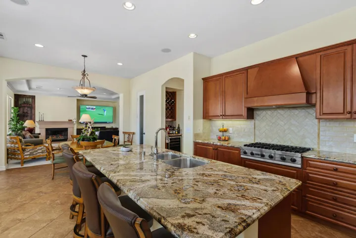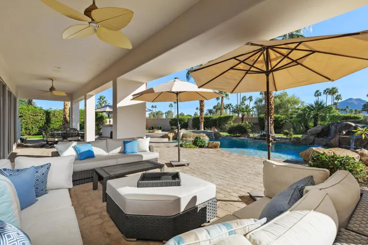 Walls of glass frame stunning mountain and garden views throughout the great room featuring 10′ ceilings, crown molding, a glass fireplace, hard-wired speakers, and a security system. The chef’s kitchen offers granite counters, tiled backsplash, double ovens, stainless Viking appliances, and a center island with bar seating. A family/media room adjoins the main living area, and the floor plan provides excellent separation with the primary suite set apart from the guest rooms.The property showcases panoramic mountain views front and back on one of the largest lots in gated Hidden Canyon. A resort-style setting includes a cascading waterfall flowing into the sparkling saltwater pool/spa, expansive paver decking, a full-length covered patio, landscape lighting, fire pit, built-in BBQ kitchen, and outdoor shower. An extended driveway for up to 12 vehicles leads to an oversized 3-car garage with new epoxy floors.A private luxury retreat with exceptional indoor-outdoor living in a premier community close to all amenities.