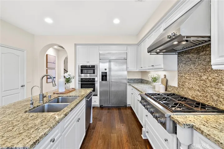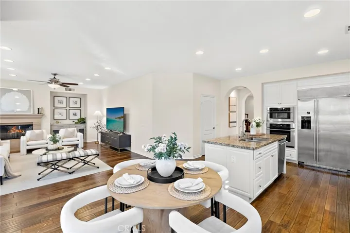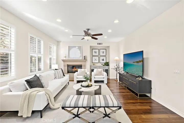 The open-concept layout highlights formal living and dining rooms, a spacious family room with a cozy fireplace, and a chef-inspired kitchen complete with granite countertops, center island, walk-in pantry, stainless steel appliances, and a built-in refrigerator. The elegant primary suite creates a private retreat with a fireplace, dual vanities, soaking tub, separate shower, and walk-in closet. Additional upgrades include hardwood floors, plantation shutters, recessed lighting, and designer interior paint.