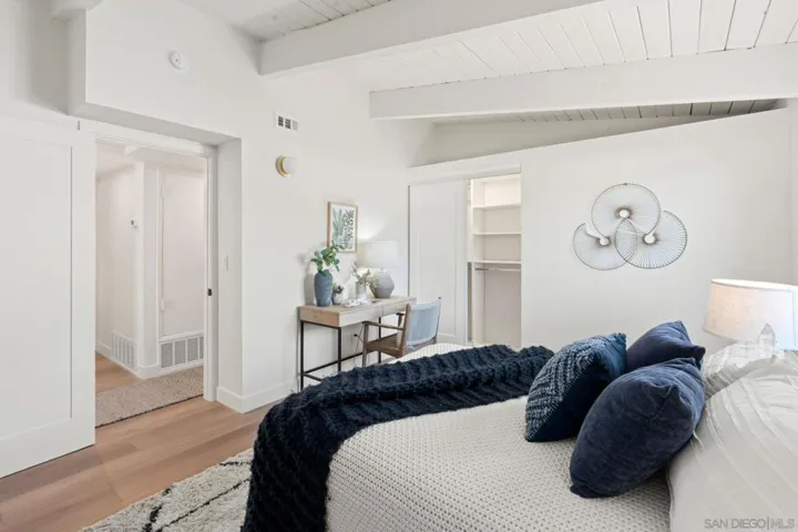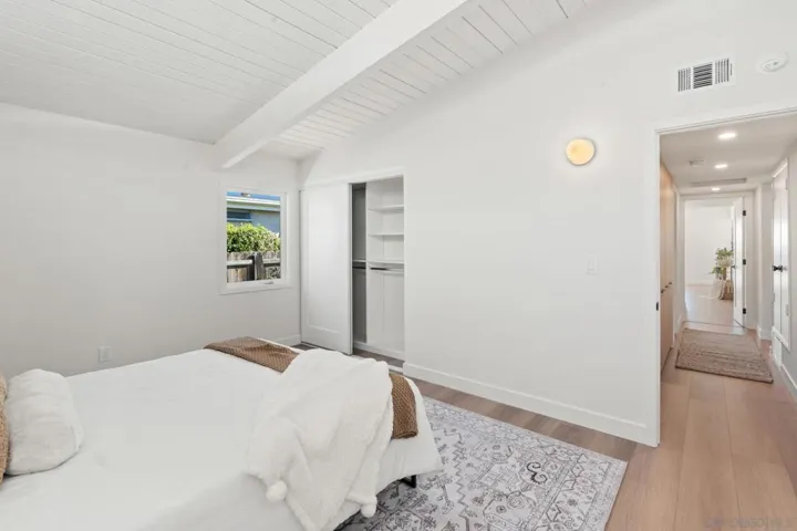 Welcome to a stunning, fully remodeled home showcasing classic mid-century architecture just moments from the sand in North Pacific Beach. This residence blends iconic design with modern luxury, offering an elevated coastal lifestyle in one of San Diego’s most desirable beach communities. The heart of the home features a gorgeous designer kitchen with a large waterfall island, sleek custom cabinetry, statement backsplash, and premium finishes throughout. Just off the kitchen is a beautifully appointed butler’s pantry with its own sink, ideal for prep, storage, and entertaining, along with a custom floor-to-ceiling built-in hutch complete with a wine fridge, creating the perfect space for display and hosting. The primary suite is a true retreat, showcasing breathtaking views of Mission Bay to the downtown skyline — views you can enjoy directly from bed. The spa-inspired primary bathroom features custom vanities, exquisite tilework, and a spacious walk-in closet with beautiful built-ins designed for both style and organization. Step outside into your private resort-style backyard, finished with travertine stone throughout, a sparkling pool, and a built-in BBQ and bar area, perfect for entertaining or relaxing in true Southern California fashion. Two additional bedrooms are generously sized, each offering custom-built closets, designer lighting, curated modern finishes, and seamless indoor-outdoor living.