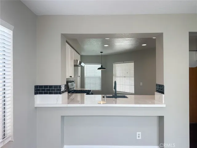 As you enter the home, you will be greeted by two story ceilings in the living room; making it feel bright and airy. The kitchen has stainless steel appliances and brand new quartz countertops. There are two sliding doors that lead into the backyard, which features low maintenance hardscaping and artificial turf.