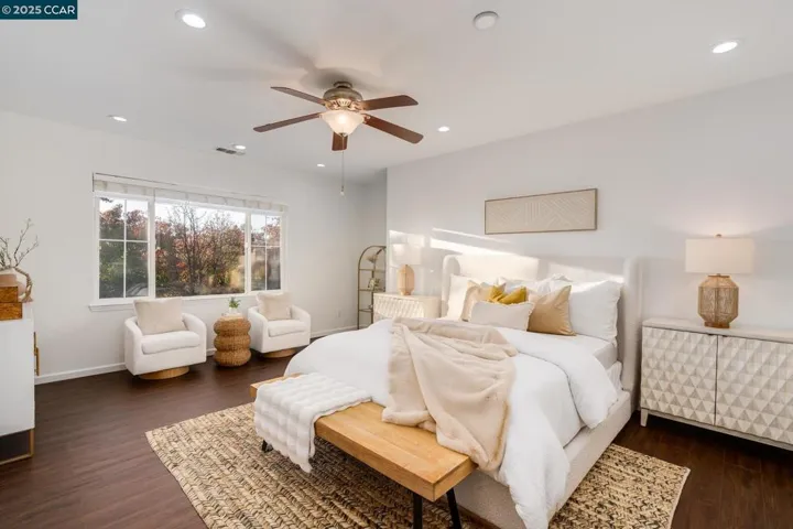 Welcome to this beautiful east facing home in the highly sought after Windemere community with owned solar. The formal living and dining rooms greet you with custom lighting and warm ambiance before flowing into the impressive eat in kitchen and spacious family room. The kitchen features a large island with bar seating, built in stainless steel appliances, and sunny breakfast nook. The main level also offers a desirable bedroom and full bath, perfect for guests or multi generational living, along with a convenient laundry room. Upstairs, the primary suite includes a walk in closet and an ensuite bath with dual sinks, a soaking tub, a vanity area, and a stall shower. The upper level also features a large bonus/media room with a home theater system and projector, plus two generous secondary bedrooms and Jack & Jill bath. Step outside to a private backyard with a gas line ready for grilling or a future outdoor kitchen, surrounded by fruit bearing trees including lemon, cherry, peach, guava, pomegranate, and apple. Close to award winning San Ramon Valley schools, scenic parks, beautiful trails, and City Center shopping and dining. This is truly an ideal choice for modern family living in one of San Ramon’s most desirable neighborhoods.