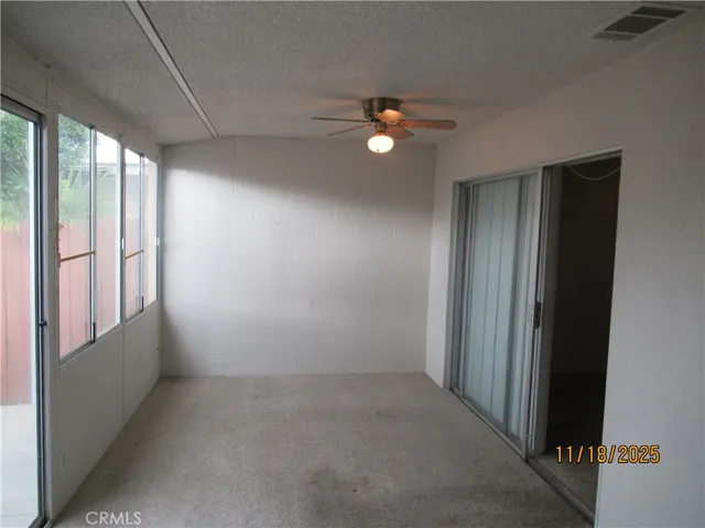 Open floor plan a sunroom with sliding door to back courtyard and a two-car garage.