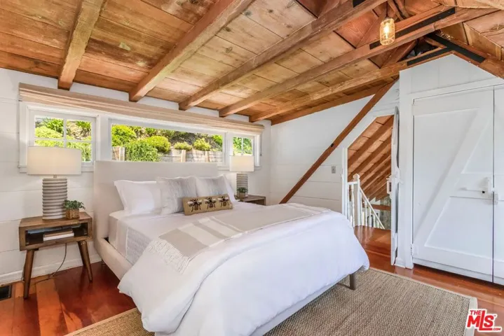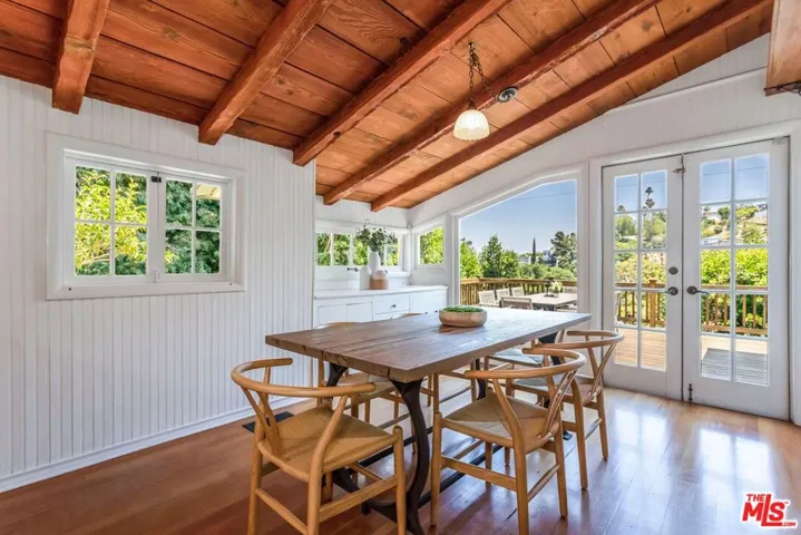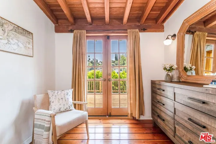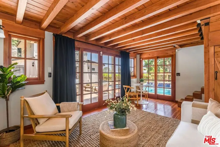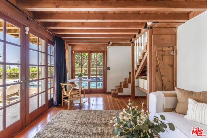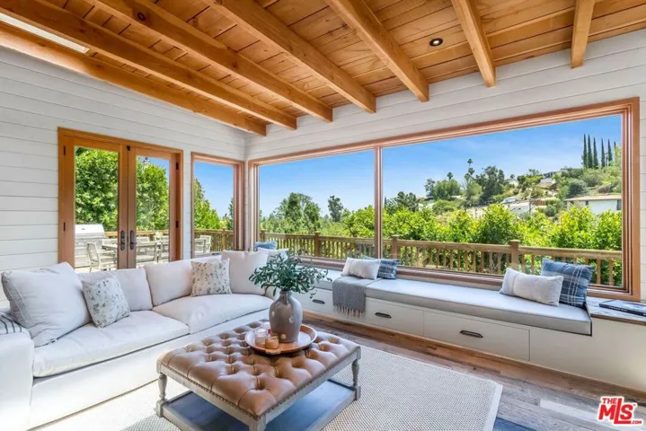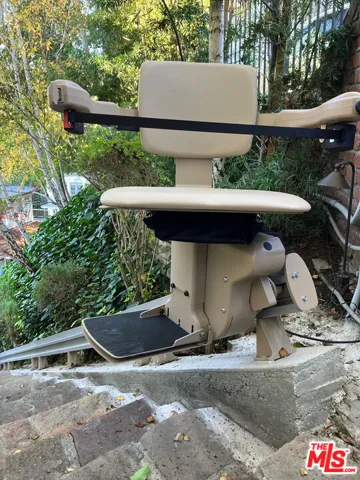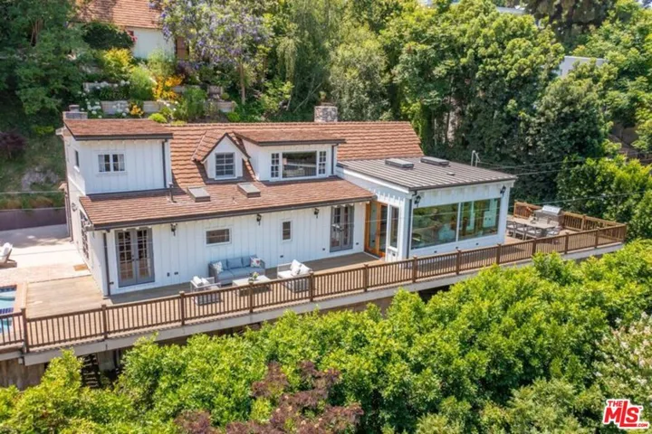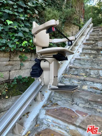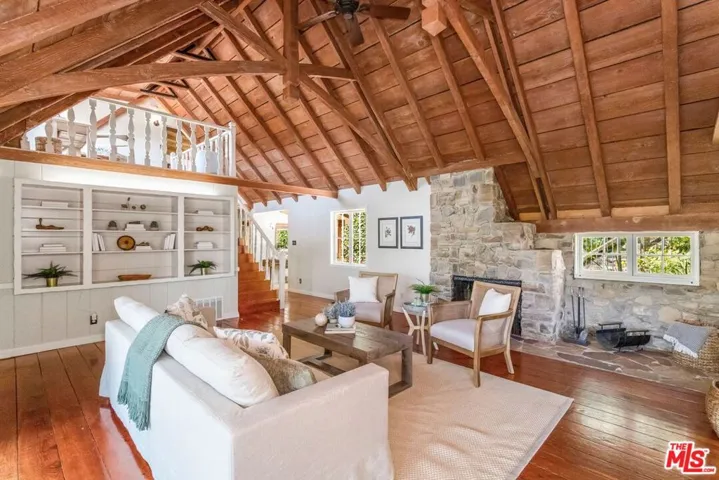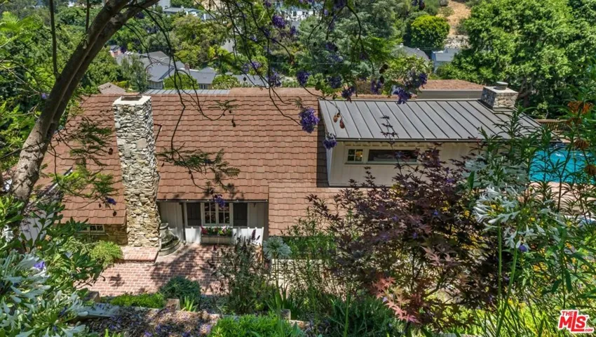 NEW exterior moving stairlift! *This magnificent Connecticut-style residence is situated on approximately 1/3 acre in the Sherman Oaks Hills. Built in 1942 and reminiscent of Robert Byrd’s detailed architectural design, the captivating family home is a gated, hidden haven that features 3bd/3ba in the main house, plus a separate 1bd GUEST HOUSE (not included in sq footage), a large POOL with FOUNTAINS and SPA, and breathtaking VIEWS. After descending the custom stone staircase, guests are greeted by a storybook home that is incomparable in design and charm. The interior spaces boast remarkable craftsmanship, including a living room with handcrafted wood beams supporting a vaulted ceiling, hand-pegged floors, a large decorative fireplace, and bespoke latch doors and bookcases. The adjoining expansive great room incorporates reclaimed wood plank floors and massive windows on three sides to shower the space with light while framing the magnificent exterior vistas. Artistic detailing has been retained in the custom-built kitchen with its sunny breakfast area and beautifully crafted built-ins, while the cooking area is equipped with granite counters and the original 1947 O’Keefe and Merritt stove. Included in the impressive primary suite is a massive stone fireplace, walk-in closet, a bathroom with a clawfoot tub, and an adjoining alcove/study with pool access. One of two enchanting guest suites completes the lower-level bedroom wing. A second-story loft/office area with sweeping views leads to an additional guest suite with pitched ceilings and a large private bathroom complete with a sitting/dressing area. French doors throughout the home open to the enormous deck that accommodates several large entertainment spaces with barbecue areas, as well as a sparkling POOL that features a built-in spa, fountain, and an automatic cover. Overlooking the pool, the 2-story bonus GUEST HOUSE is suitable for use as an office, guest quarters, studio, or media room(s) with access to a detached bathroom with shower. The custom stonework and lush landscaping with colorful florals all add to the magical outdoor ambience. Street-level parking includes a two-car garage and two extra parking places. The new custom stairlift serves as an alternative to the exterior staircase that leads to this hidden oasis. This extraordinary celeb-owned home, perfect for family living as well as for entertaining, is not only emotional…it is unforgettable!