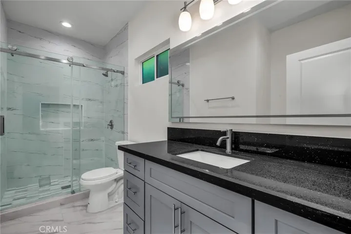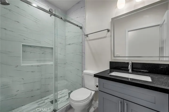Large private primary bedroom with en-suite bathroom with a standing shower with upscale fixtures and a single-sink vanity.Guest bedroom is located off of the hallway. There is a hallway bath which features a standing shower with high-end sliding glass door. Laundry closet conveniently positioned adjacent to the bath. The 2 bedrooms don’t share walls.