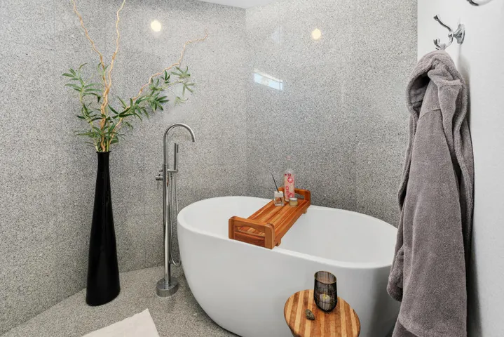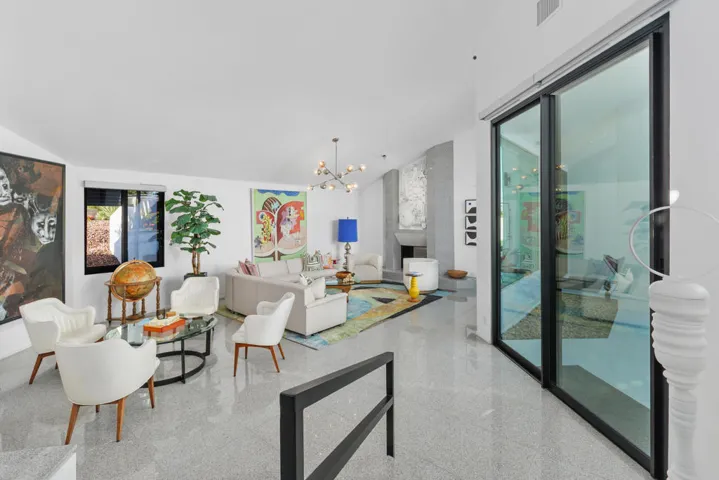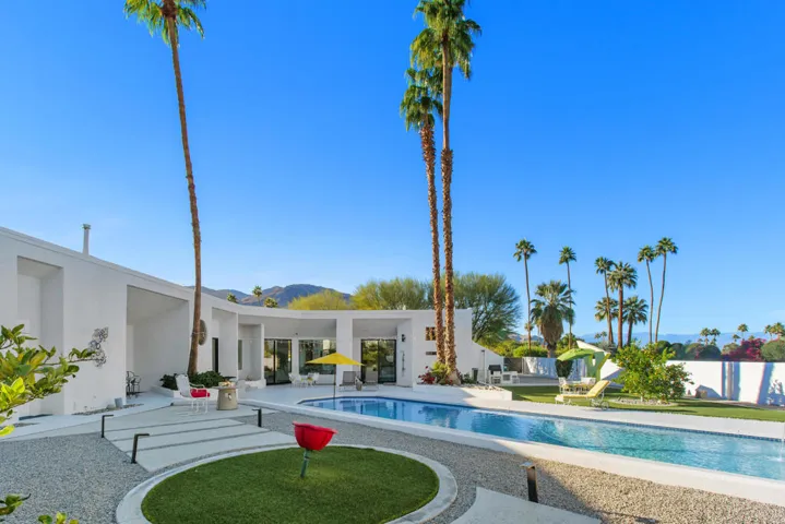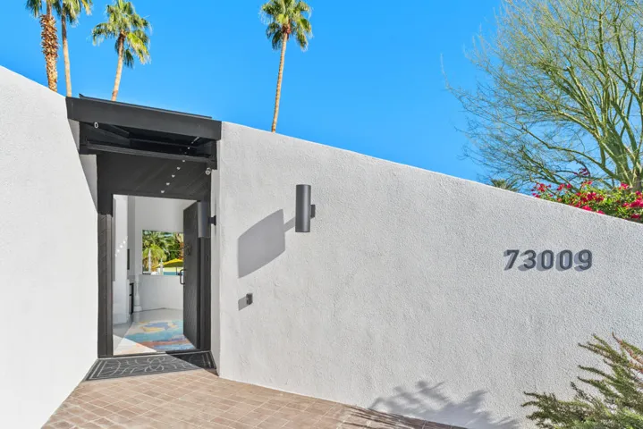 Discover a rare architectural retreat by noted architect Charles L. Martin, offering privacy, panoramic mountain views, and exceptional efficiency just moments from El Paseo. Set on a nearly half an acre lot, this historically significant 2-bedroom, 3-bath home with den/TV room and bonus room with Murphy bed lives as a refined yet playful desert escape. Dramatic ceilings and custom window geometry flood the interiors with natural light while maintaining comfort from morning through evening. Major upgrades respect the home’s mid-century modern character, including new Fleetwood sliders, dual-pane low-e windows, and a louvered entry skylight, along with a freshly repainted exterior. A standout feature is the Tesla Solar Roof with two Powerwall batteries, delivering substantial energy savings and dependable backup power, a true advantage in the desert climate. Outdoors, a saltwater pool and spa with both heating and cooling anchor a secluded oasis framed by mature landscaping and a citrus grove. Inside, the updated kitchen features new counters, backsplash, sink, fixtures, lighting, and a Thermador induction cooktop. The media room is designed for immersive viewing with a 100” LG laser projector, motorized screen, and 8-speaker Dolby Atmos sound. The spacious primary suite offers a walk-in closet, double vanities, and a spa-like wet room with large walk-in shower and soaking tub. Guests enjoy a private suite of their own, while the versatile bonus room with Murphy bed and storage flexes easily as guest quarters, fitness area, or studio. Practical amenities include an extended driveway with generous parking, two-car garage plus golf cart/RV parking, and light-touch smart-home features: automated shades, app-controlled pool system, and integrated climate and security. With no HOA and a premier South Palm Desert location, this exceptional property blends timeless design, energy-smart innovation, and true privacy for effortless desert living.