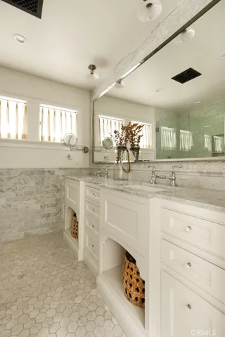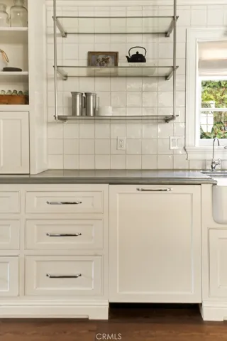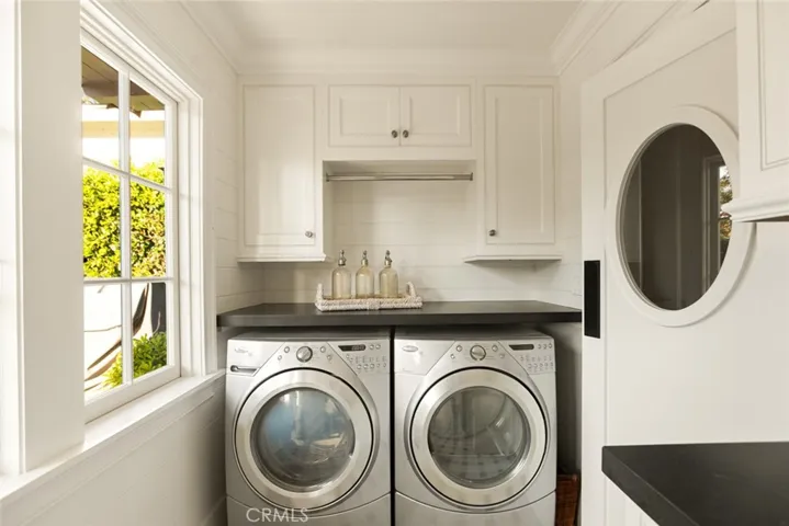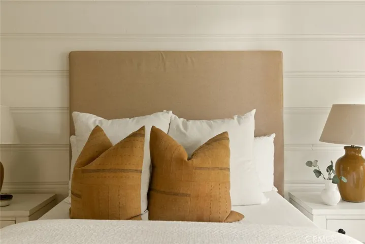 Just three blocks from the sands of Laguna Beach’s gorgeous Woods Cove, this ocean-view coastal cottage-inspired home blends luxury, elegance and a touch of classic European flair. Remodeled by award-winning local designer Andra Miller, the custom residence showcases beautiful views of the Pacific Ocean and Laguna Beach coastline from indoor and outdoor living spaces, which easily flow from one to the other through glass doors leading to private patios and sunny balconies. Impressively sized at approximately 2,762 square feet, the four-bedroom, three- and one-half-bath design elevates open-concept living with a split-level main floor. A Dutch entry door welcomes friends and neighbors to a family room with corner fireplace, vaulted ceiling and an ocean-view balcony. High ceilings continue in a double-height foyer that showcases a skylight, elegant staircase and an built-in under-stairs office niche with desk. The foyer seamlessly transitions to a formal dining room that opens to the backyard and a phenomenal designer kitchen with a nook leading to a covered front porch. Enjoy top-of-the-line stainless steel appliances that include a six-burner Wolf range with griddle, and a Sub-Zero refrigerator that boasts a glass door and convenient drawers. An island topped with Carrara marble includes bar seating, an under-counter beverage refrigerator and a prep sink, and zinc countertops, white cabinetry with glass uppers, open shelving, farm sink and a full tile backsplash complete a truly stunning culinary showplace. Traditional and contemporary details are led by high open-beam tongue-and-groove ceilings, extensive custom built-ins in bedrooms and living areas, wide-plank French oak flooring, elegant crown molding and wainscoting, white-paneled walls, marble-finished baths, designer floor tile, in-ceiling speakers, and classic lighting fixtures including antique European pendants. Guests will appreciate a main-level suite that opens to the backyard, an upstairs secondary bedroom that presents an ocean-view balcony, and the refined primary suite displays ocean views and a walk-in closet. Pacific vistas continue in the primary bath, which shines with a freestanding tub, brick floor, two sinks and a frameless glass-enclosed multi-head shower. A towering shade tree enhances the private front-yard patio, and the backyard features a spacious deck, built-in seating, spa, and a versatile artist shed. Restaurants, galleries and shops are just down the street.