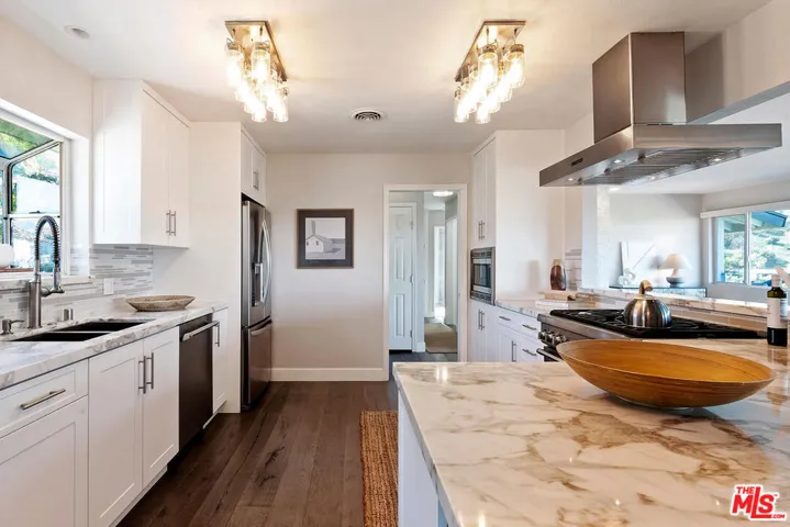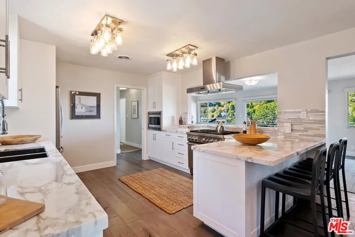 Experience spectacular city-light, canyon, and mountain views from this tastefully remodeled traditional home located on a quiet street in the hills of Sherman Oaks. Step inside to a light and airy living space with an open-concept floor plan designed for everyday living and entertaining. The living and dining area features a fireplace and glass doors that open to an expansive terrace with forever views. The gourmet kitchen offers an island, stainless steel appliances and a breakfast area. The large primary bedroom suite includes a second fireplace, a sitting area, a covered view terrace, and a luxurious bathroom with a soaking tub, glass shower, and dual vanities. There is also a huge walk-in closet. Two additional bedrooms also have walk-in closets and their own bathrooms. The attached garage provides direct entry to the home, with additional off-street parking in the driveway. Glenridge Drive is known for having some of the best views in Sherman Oaks.