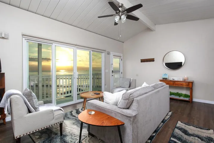 Rare true oceanfront income property in Sunset Cliffs with sweeping ~280° sit-down ocean views, exceptional privacy, and beautifully renovated, turn-key interiors. Includes four upgraded 2BR residences plus two well-finished bonus studio units, offering excellent flexibility and income potential. Renovations from 2020–2025 include quartz counters, stainless appliances, LVP flooring, updated baths, dual-pane windows, and cohesive coastal-modern finishes. Three residences perform strongly as VRBO short-term rentals, while the remaining units are month-to-month long-term rentals with significant upside. Additional highlights: rare 4-car garage, new garage doors, new staircases, and multiple ocean-facing decks/patios. The renovation included major permitted improvements, expanded living areas, and comprehensive upgrades to core systems including HVAC with central air conditioning, plumbing, and electrical, along with a newly rebuilt garage and additional finished living space above. Multiple outdoor decks were created to maximize panoramic views, including decks off the primary suite, living area, and the library/bedroom suite above the garage. The kitchen is appointed with a full Thermador suite including refrigerator/freezer columns, wine refrigerator, double ovens, and a 6-burner range with griddle and pot filler, plus a large granite waterfall island with seating for five. Decking is Trex with updated iron railings, and the patio is plumbed for gas for a future fire feature. The primary suite features Italian Carrara marble finishes, dual sinks, separate water closet, walk-in closet and additional closet storage, and the primary bath and powder room are equipped with bidets. The lower level functions as a true guest suite with a spacious family room, full kitchenette, separate entry, laundry, large closets, plus a private bedroom and full bath.