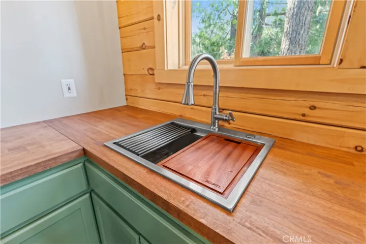 Inside, the solid wood door closes with a confident boom, settling you into a space built for quiet and comfort. Its 8-inch square-log, channel-style construction holds heat in winter and coolness in summer, creating an immediate sense of shelter. The charming kitchen features butcher-block counters, sage cabinetry, a Ruvati workstation sink, and a gleaming Summit propane range ready for winter breakfasts and slow suppers.