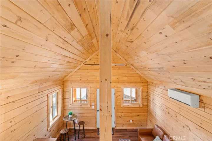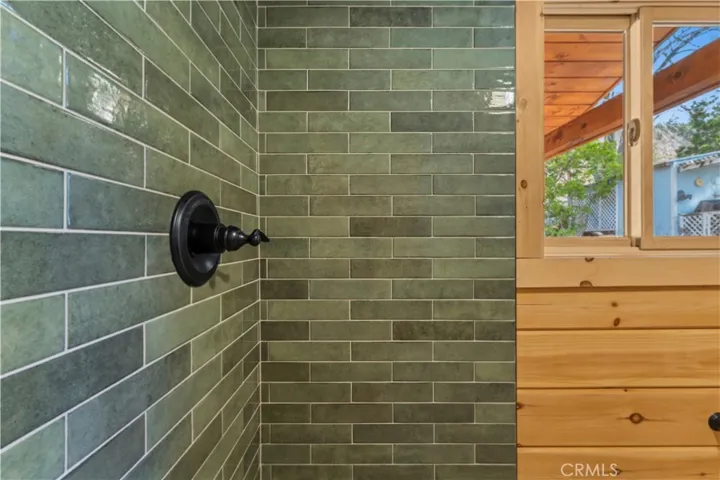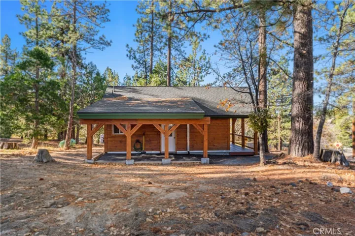 A handcrafted ladder leads to the cozy loft, filled with soft light. Down the hall, the main-level bedroom feels grounded and calm, complete with its own whisper-quiet mini-split—one of two in the home—for true year-round comfort.The bathroom blends rustic charm with artisan detail: an antique vanity topped with a hammered copper basin and a waterfall-style walk-in shower wrapped in deep mountain-green tile. A tankless water heater provides endless warmth, and a compact washer and dryer add ease for longer stays.Thoughtful upgrades include a hidden fire-suppression system, dual-pane windows, and a brand-new composition roof designed for winter snow. The covered carport and level driveway provide rare, reliable access through all seasons. Towering pines, granite outcroppings, and the gentle slope of the land give the property a timeless, quiet presence. From above, Arrowbear Lake shimmers like a mountain secret, the community nestled among evergreen ridgelines with Mount Baldy rising on the horizon. City water and sanitation, plus efficient propane for heating and cooking, blend modern comfort with natural simplicity. A newborn cabin in an old-soul forest—inviting, warm, and ready to become your mountain retreat.
