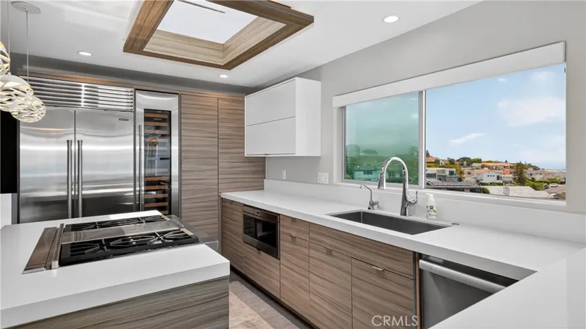 Fully furnished. Open to 6 months, month to month, short term- negotiable. Located at the end of a private cul-de-sac atop Arch Beach Heights, this striking split-level contemporary residence offers unobstructed 180-degree ocean and coastline views, with Catalina Island and twinkling city lights stretching beyond Laguna Beach, visible from nearly every room. Set on an exceptionally rare double-wide lot, the home spans nearly 2,350 square feet and features 4 bedrooms, 3.5 baths, a dedicated office (optional 4th bedroom), a private theater, and a custom wine room. Originally reimagined in 2007 by acclaimed designers Anders Lasater and Mark Singer, the home blends bold design with timeless quality. The spacious primary suite includes a custom-built closet system and an expansive spa-like bathroom complete with a steam shower, soaking tub, and a built-in TV for the ultimate retreat. Upstairs, the main living area boasts an open-concept layout with hardwood and stone flooring, a chef’s kitchen with stainless steel appliances—including a Bosch ultra-quiet dishwasher—cherry wood cabinetry, granite counters, skylights, a breakfast bar with a mini-fridge, and a center island cooktop. Sliding doors lead to both front and rear decks, seamlessly extending the living space outdoors. This exceptional property offers the rare combination of architectural sophistication, functional design, and breathtaking natural beauty. Just moments from world-class beaches, hiking trails, restaurants, and vibrant village life, this home is not only a peaceful retreat but also a gateway to the very best of coastal living. Whether you’re entertaining guests or enjoying a quiet evening overlooking the Pacific, this one-of-a-kind residence delivers an unparalleled lifestyle experience.