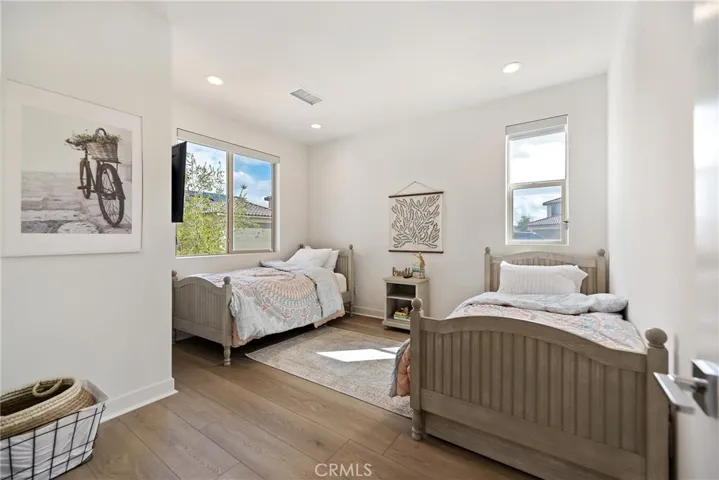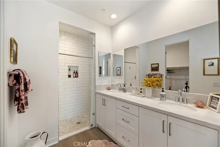 Inside, the bright and airy layout features a modern kitchen with an island, bar seating, white cabinetry, quartz countertops, marble backsplash, and stainless steel Samsung appliances. The primary suite includes a walk-in closet and an ensuite bath with dual sinks and a walk-in shower, offering a spa-like retreat. Throughout the home, luxury vinyl plank flooring adds a contemporary touch. Additional conveniences include a dedicated laundry room with Samsung washer and dryer, a tankless water heater, and owned solar panels, ensuring energy efficiency and lower electricity costs.
