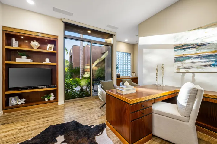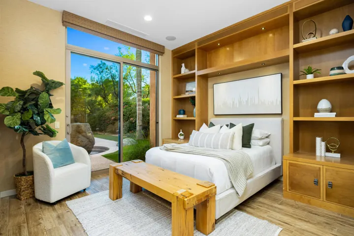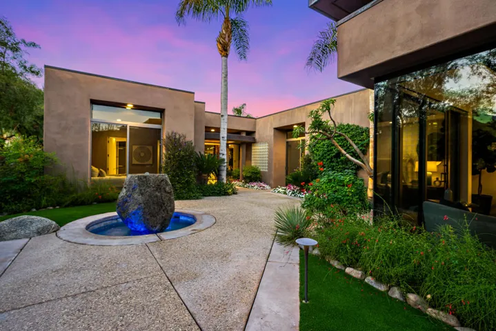 This is a lovely desert contemporary villa, located in the world-renowned Bighorn Golf Club (on the Canyons side), in picturesque South Palm Desert, boasting a spacious 3,314 SF, on a nearly .40 acre lot! Enter through a beautifully landscaped courtyard with a bubbling water feature, into a large great room featuring dramatic ceilings, Travertine flooring, a convenient wet-bar and a lovely stacked-stone, raised hearth fireplace. The open concept kitchen invites seamless entertaining and features granite countertops, high end appliances and a wine refrigerator. The large primary suite has a cozy fireplace and a generous bath. There are two additional ensuite bedrooms in the main house (one is currently being utilized as an office), plus a powder room. The private, detached casita features high ceilings and a convenient refrigerator and sink. The great room leads out to a covered patio with large fireplace, and the backyard is absolutely gorgeous, with a recently refurbished lagoon style pool, a spa that bubbles into a small pond, a custom BBQ area, firepit feature, and a fun putting green! This home embodies the deserts’ coveted indoor/outdoor lifestyle! Home is staged and furnishings can be purchased outside of escrow. Come home to Bighorn!