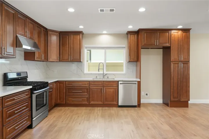 A 2-bedroom, 2-bathroom ADU with 1 car parking spot, offering 1,200 square feet of thoughtfully designed living space in the desirable Granada Hills Charter School District. Priced at $3,300 per month with a one-month security deposit. Enjoy central heating and cooling, side-by-side laundry hookups with convenient overhead shelving, and a kitchen outfitted with soft-close wood cabinets and pull-out drawers for maximum storage. The unit includes separate electrical and solar panels, a dedicated water sub-meter, and available street parking. Inside, the home is illuminated with ample recessed lighting throughout, including dimmable fixtures in the bedrooms and a zoned, dimmable lighting system in the living room. The bathrooms lighting is sectioned based on usage needs — including enhanced brightness for tasks like makeup application. A small entry closet provides a convenient spot for shoes, jackets, and keys. Both bedrooms include closets with elevated shoe racks for easy cleaning, while the master bedroom boasts an oversized closet with wired motion-sensor recessed lighting. The bathrooms are designed with custom mirrors, mirrored medicine cabinets, and hand-assembled wood vanities topped with quartz countertops. The master bath also includes a spacious double-sink vanity for added convenience. The elements of this rental have been curated to offer a blend of comfort, functionality, and elevated design.