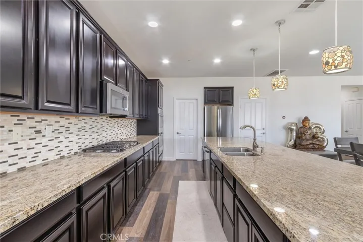 The open kitchen is a standout, featuring a large center island, granite-style counters, stainless steel appliances, and generous cabinetry. Its open layout makes everyday cooking and hosting effortless.