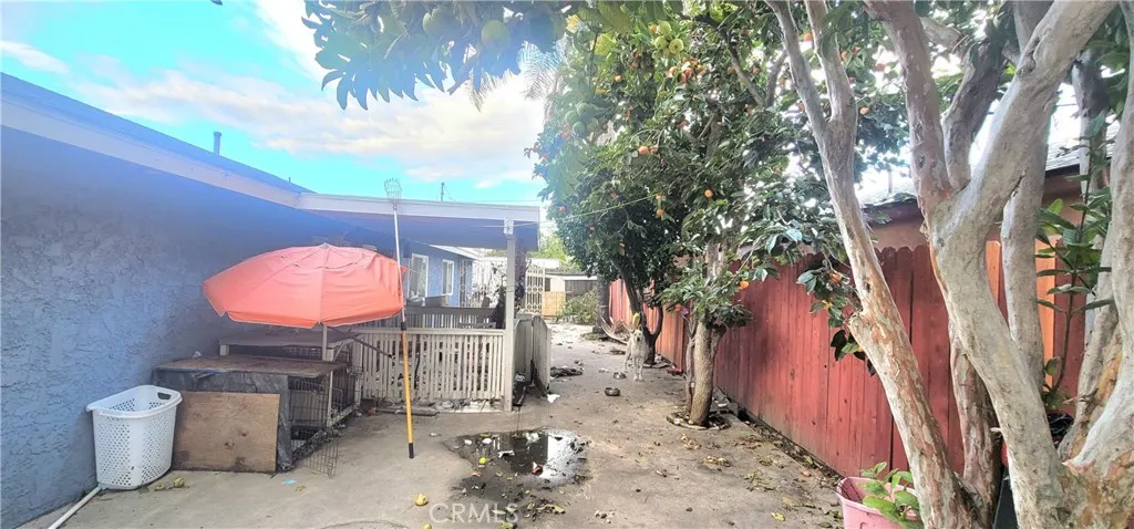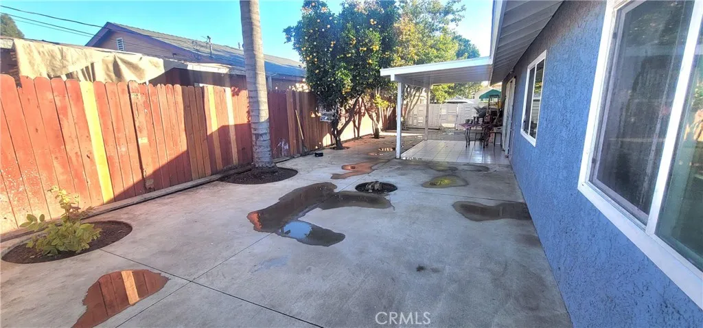 Low-maintenance huge backyard with extensive concrete and a large patio perfect for gatherings.