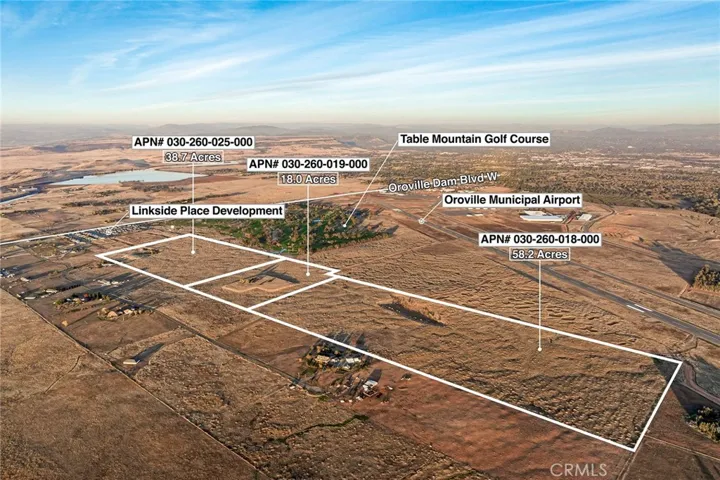 PRIME DEVELOPMENT OPPORTUNITY with this 115± acre land offering located at the edge of the Oroville City Limits and directly adjacent to the 18-Hole Table Mountain Golf Course. Featuring approximately 2,200 feet of golf-course boundary frontage, this property presents exceptional potential for a rural-residential or golf-oriented development concept, including 5-acre estate lots under the current RR-5 zoning. The land borders Linkside Place Phase II to the north, including the tentatively approved Linkside Place Phase II subdivision consisting of 56 future homesites. Phase II has underground utilities already installed and roads graded, awaiting paving, signaling strong forward momentum for continued residential growth in this corridor. Linkside Place Phase I, just north of Phase II, was completed in recent past with 65 homes and demonstrates proven development success in this immediate area. This prime 115± acres is made up of three legal parcels: APN 030-160-019 (18.08± acres), APN 030-260-025 (38.79± acres), and APN 030-260-018 (58.24± acres). Just over 1,000 feet west lies the previously City-approved 421-acre Oro Bay master plan area, once approved for approx. 2,400 homes, showing the long-term development vision for this part of Oroville. Power, water, and sewer currently extend to Linkside Place Phase II at the northern boundary of this property. With Oroville’s growing population, multiple new housing projects underway, and demand for quality development opportunities, this acreage sits directly in the path of expansion. Located just south of Oro Dam Blvd, the main connector between Highways 70 and 99, and approximately 4 miles to downtown Oroville, 25 miles to Chico, and 70 miles to Sacramento. Close to recreation including Lake Oroville, the Feather River, and the Afterbay recreation and boat launch facilities just up the road.