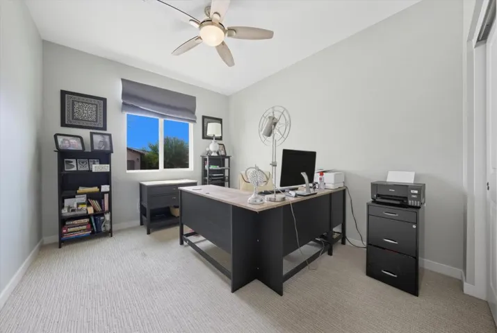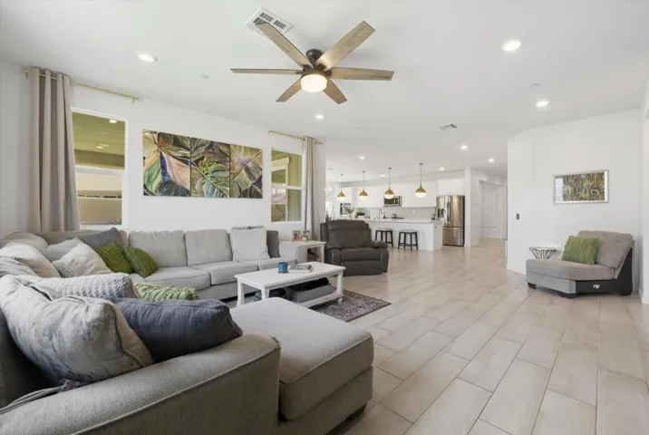 Price Reduced! Ready to Sell! Stunning home in the highly desired gated community of Paradiso! This 4-bedroom, 3-bath showplace sits on an oversized corner lot of more than 10,000 sq ft and radiates model-home style from the moment you walk in … GORGEOUS!Inside you’re greeted with soaring ceilings, designer plank-style tile flooring (YES — that is tile!) and a bright, open layout perfect for entertaining. The gourmet kitchen is a true centerpiece with an eye-catching backsplash, oversized quartz countertops, stainless steel appliances including double ovens, a large center island with seating, recessed lighting, and a walk-in pantry. A spacious formal dining room offers flexibility as a home office, media room, or play space.The split floor plan provides a private retreat for the primary suite with direct backyard access, a large walk-in closet, dual vanities, a soaking tub, and a separate walk-in shower. Three guest bedrooms are set apart on their own wing — ideal for family and visitors — and feature upgraded carpet, ceiling fans, custom window shades, and ample storage.Outside, the expansive yard wraps both sides and the rear of the home, creating an exceptional blank canvas for your dream pool, putting green, outdoor kitchen, or fire-pit lounge under the stars. Paid solar keeps energy costs low.But WAIT there’s MORE! The oversized three-car garage is approximately 10 feet deeper than standard with high ceilings, LED lighting, and space for trucks, toys, or extra storage … a garage lover’s dream!Low HOA dues include cable and Wi-Fi. Close to top schools, shopping, I-10 access, and world-class golf and tennis, this property blends everyday comfort with vacation-style living… truly the perfect primary residence or desert getaway!
