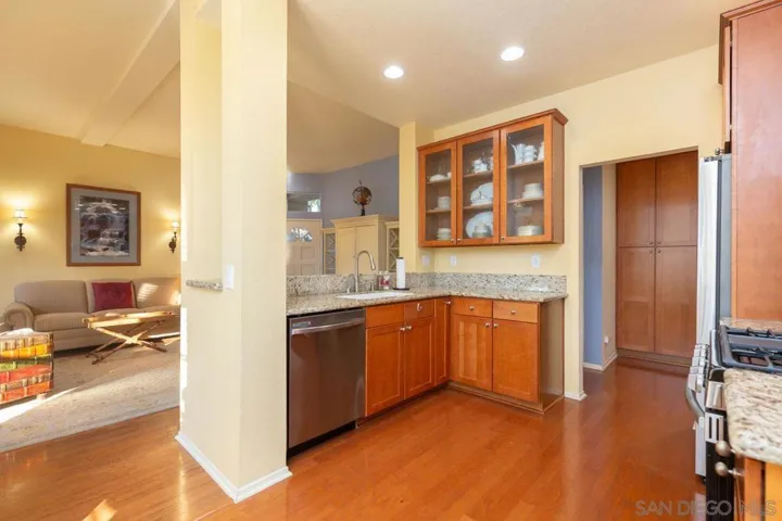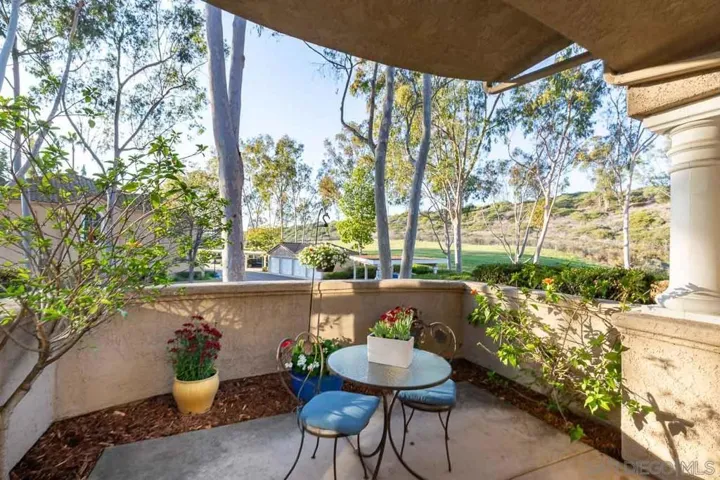 Bright and inviting 2-bedroom, 2-bath first-floor home in Belsera with 10’ ceilings and solid-surface floors through much of the space. Living room offers a cozy fireplace and smooth flow into dining area and updated kitchen with brand-new stainless appliances. Primary bedroom includes a walk-in closet and en-suite bath with double-sink vanity. Second bedroom works well for guests or a home office. Updated kitchen and main bath add to the move-in-ready feel. Attached 1-car garage, assigned parking space, and nearby guest parking provide convenience. Belsera amenities include pools, spas, volleyball court, and BBQ areas. Walking trails, nearby shops, and local restaurants support an easy outdoor lifestyle in Tierrasanta.