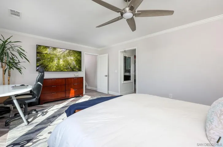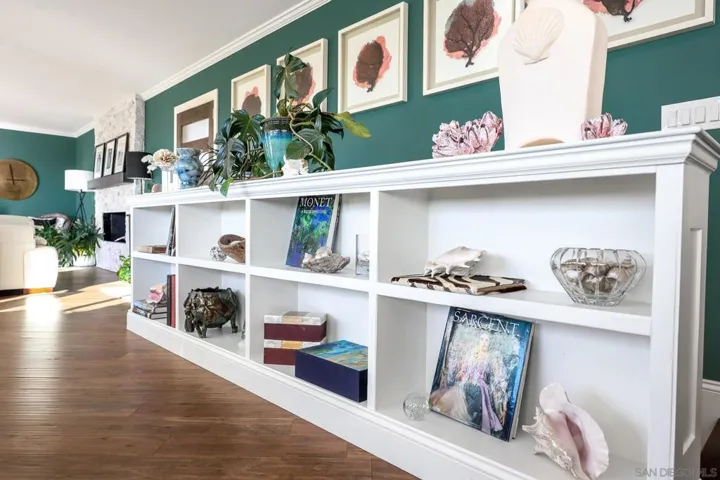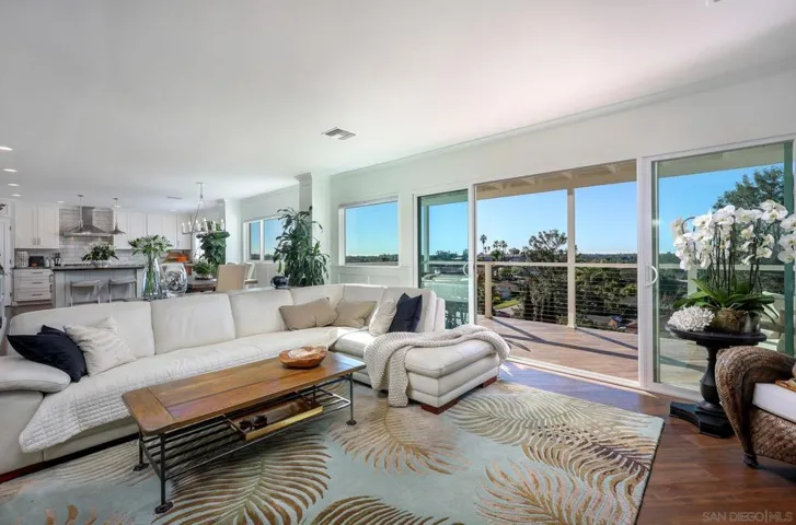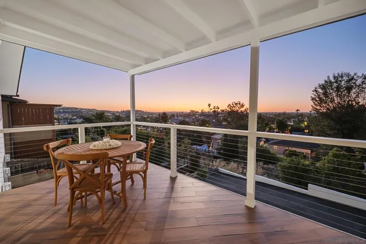 Incredible panoramic western sunset views and a walkable location—steps from dining, shops, parks, farmers markets, and community events in Downtown La Mesa—are only the beginning of what this home offers. From the water-wise landscaping to the solid mahogany entry, every detail reflects intention, craftsmanship, and pride. Inside, warmth and character define the home. Upstairs, crown moulding, custom wainscoting, and diagonal hardwood floors create a timeless feel. The kitchen features custom shaker cabinetry, quartzite countertops, an oak butcher-block island, Bosch appliances, a copper farmhouse sink, a walk-in pantry, and designer lighting. The upgraded balcony, finished with porcelain tile and cable railings, provides a peaceful place to unwind. The upper bath brings spa-inspired comfort with pebble flooring, an Italian vessel sink, a custom concrete countertop, and Tommy Bahama glass tile. Downstairs, luxury vinyl plank and upgraded moulding continue the cohesive design. The primary suite includes a freestanding soaking tub, walk-in shower, marble flooring, backlit mirrors, and a walk-in closet. Utility spaces are equally thoughtful, featuring a mahogany-appointed laundry/mud room, a fireclay sink, and additional storage in both the semi-finished attic and crawl space. Modern upgrades include owned solar, 200-amp service, a tankless water heater, and newer HVAC. The expansive lot offers space for gardens, outdoor dining, or potential ADU exploration. With a garage and extra driveway parking, the home is ready for guests, hobbies, and comfortable everyday living.