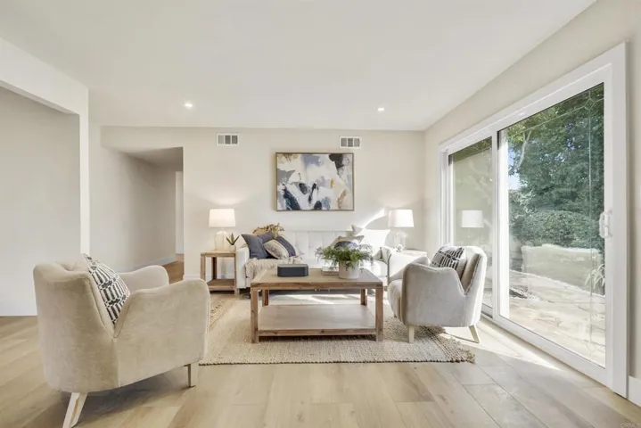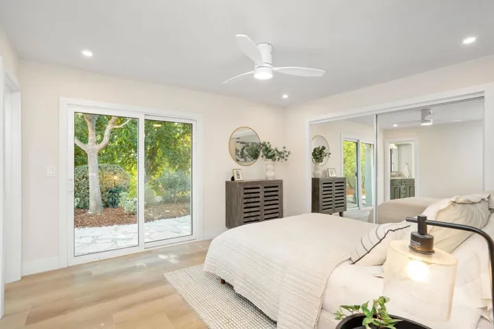 Beautifully remodeled, this luxurious single-story home features soaring ceilings, warm wide-plank flooring, and landscaped surroundings—including a tranquil pond—that reflect the area’s quiet suburban character. The open layout flows from the bright living room with a fireplace and expansive sliders to an elegant dining area with vaulted, beamed ceilings. The stunning kitchen offers shaker cabinetry, quartz countertops, stainless steel appliances, and a generous peninsula for casual seating. The serene primary suite includes soft natural light and a spa-like ensuite bath with dual vanities and an oversized shower. Three additional bedrooms are spacious and airy, while the updated hall bath showcases designer tile, warm wood cabinetry, and modern fixtures. Outdoors, the property transforms into a captivating sanctuary. The expansive backyard showcases lush greenery, meandering flagstone pathways, and mature landscaping. A tranquil pond with a waterfall feature provides a soothing backdrop to the covered patio—an inviting setting for outdoor dining, morning coffee, or evening relaxation. Surrounded by mature plantings, shade trees, and thoughtfully curated beds, the space offers exceptional privacy and year-round enjoyment. With fully owned solar for added efficiency and a location moments from parks, scenic trails, shopping, dining, and commuter routes, this exceptional Walnut residence beautifully captures the appeal of its natural, suburban setting—where comfort, nature, and modern living come together in one unforgettable home.