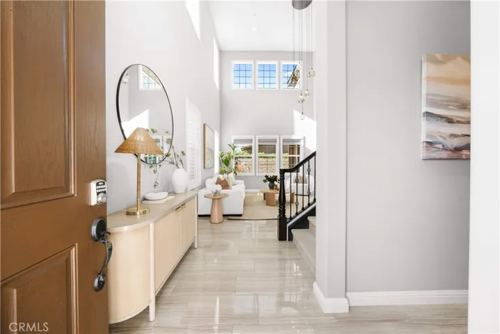 Beautifully upgraded 4-bedroom, 3-bath home located in the highly desirable community of Baker Ranch! This stunning residence features an open and airy floor plan with impressive soaring ceilings in the living room, creating a bright and spacious atmosphere from the moment you enter. The first floor is upgraded with elegant tile flooring throughout, offering both style and easy maintenance. The gourmet kitchen boasts quartz countertops, a large center island, stainless-steel appliances, and plentiful cabinetry—perfect for cooking and entertaining. The open-concept living and dining areas flow seamlessly to the private backyard, offering an ideal space for indoor–outdoor living.
