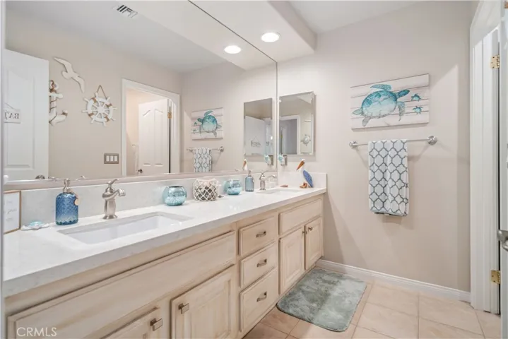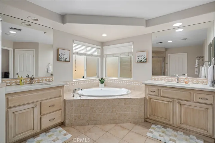 The **primary suite** offers a peaceful retreat with a large walk-in closet complete with built-ins and direct access to the backyard. The **luxurious primary bath** features quartz countertops, a large jetted tub, separate his-and-hers sinks, and an oversized shower with designer tile. All guest bedrooms are generously sized and include ceiling fans. The guest bathroom features quartz countertops, a dual-sink vanity area, and beautiful tile finishes.