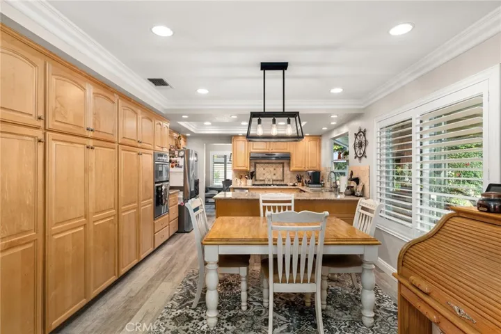 The gorgeous open-concept kitchen features granite countertops, a breakfast bar/island, rich wood cabinetry with pullout shelves, and opens seamlessly to a secondary dining area and the warm, comfortable family room with a wood burning fireplace. All bathrooms have been exquisitely remodeled, including the breathtaking primary en-suite showcasing a spacious dressing area with built-in cabinetry and generous closet space.
