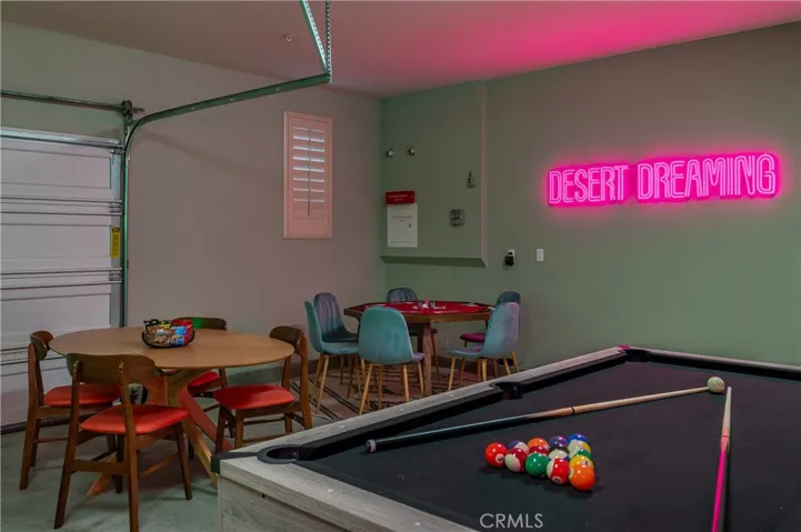 The garage has been transformed into a stylish, fully equipped game room complete with a pool table and additional entertainment features, providing a standout amenity for guests.