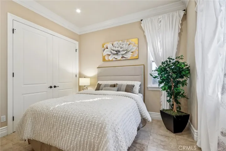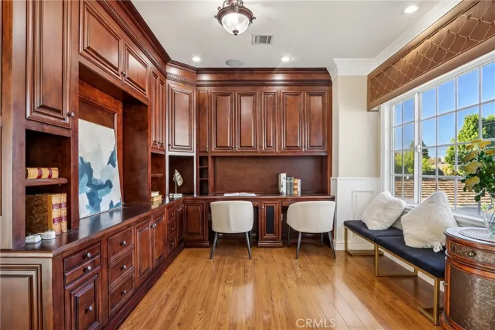 Upstairs, the luxurious primary suite includes marble finishes, a steam room, jetted tub, walk-in closet, and an attached his-and-her office with a balcony overlooking the San Gabriel Mountains. A junior suite, two additional bedrooms with a shared bath, and a den complete the upper level.
