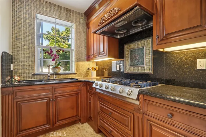 The gourmet kitchen showcases a large marble island, stainless-steel appliances, double ovens, warming drawers, and a full wok kitchen. The adjoining family room offers custom built-ins, a central AV console, and a full bar.