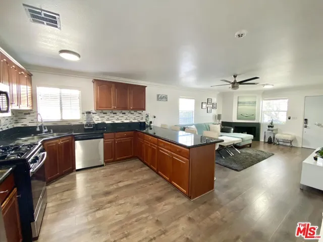 Nicely updated home in prime Mid City area. This bright and spacious free standing detached home is part of a duplex. There are two separate free standing detached homes on the lot – front home and back home, both with private gated fenced off back yards. This home is in the front and it features open floor plan with abundance of natural light, hard wood type flooring through out, large beautiful kitchen with lot of cabinets and counter space, granite counter tops and stainless steel appliances. Spacious bedrooms with large closets. Master bathroom with travertine. Private fenced off and gated back yard area. Two car garage with direct access inside of the home and laundry area. Central air conditioning and heating. It’s centrally located in prime Mid Los Angeles neighborhood near Midtown Crossing shopping center with lots of shops and restaurants. 5.5 miles from USC, 10 miles from UCLA & 1.8 miles from Expo/La Brea train station. Easy FWY access.