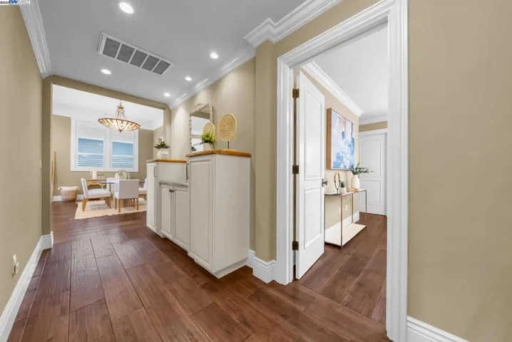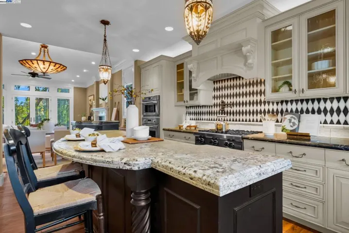A rare and exceptional offering in Crow Canyon Country Club, this beautifully reimagined single-story home was taken to the studs, redesigned, and expanded, with quality craftsmanship and a warm, timeless aesthetic. Backing to the golf course, this home features rich hardwood flooring, custom millwork, and abundant natural light. At the heart of the home is an expansive great room where French doors frame mature trees and fairway views, creating an effortless indoor–outdoor flow ideal for everyday living and entertaining. A custom cherry-wood library with floor-to-ceiling cabinetry offers a refined space for work or quiet retreat. The gourmet kitchen includes custom cabinetry, stone counters, an oversized island, designer lighting, and high-end appliances, with a wide window showcasing colorful landscaping. The dining area blends seamlessly with the main living spaces, offering flexibility for gatherings large or small. The bedroom wing provides well-proportioned rooms with good light and privacy, while bathrooms feature quality stone, tile, and fixtures. The backyard extends the living space with an expansive patio and tranquil fairway outlook.