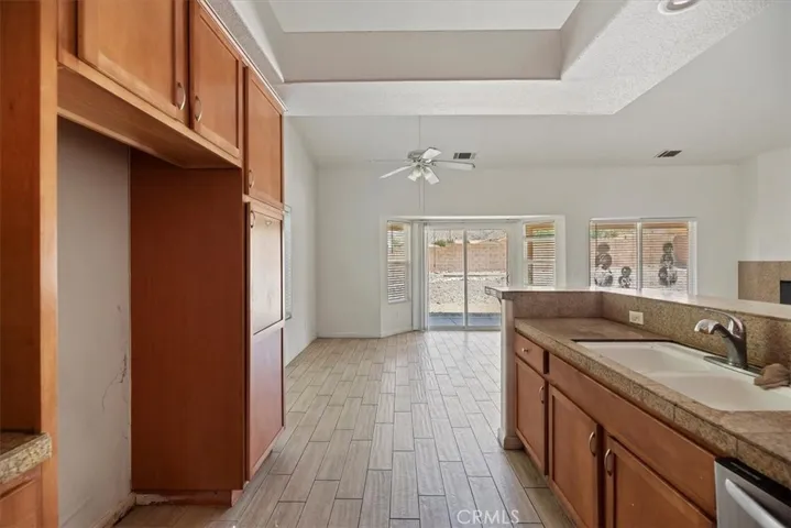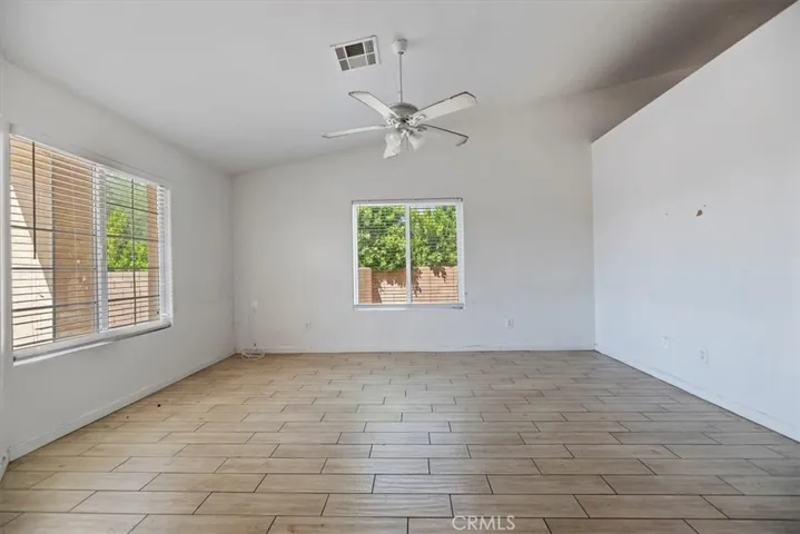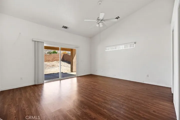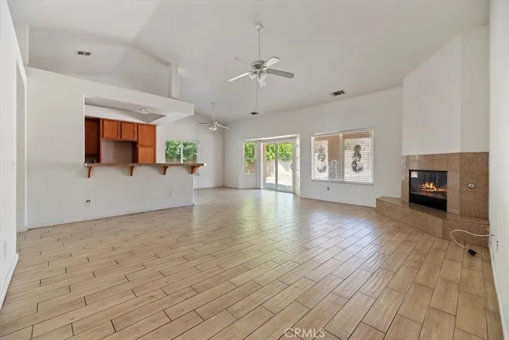 This inviting 1,837 sq. ft. home, built in 2005, offers comfortable living with beautiful desert mountain views. The open floor plan features attractive plank-look tile flooring in the main living areas and warm wood-look laminate in the bedrooms, providing easy, low-maintenance style throughout. High volume ceilings add a spacious feel, while a cozy fireplace creates a welcoming focal point.