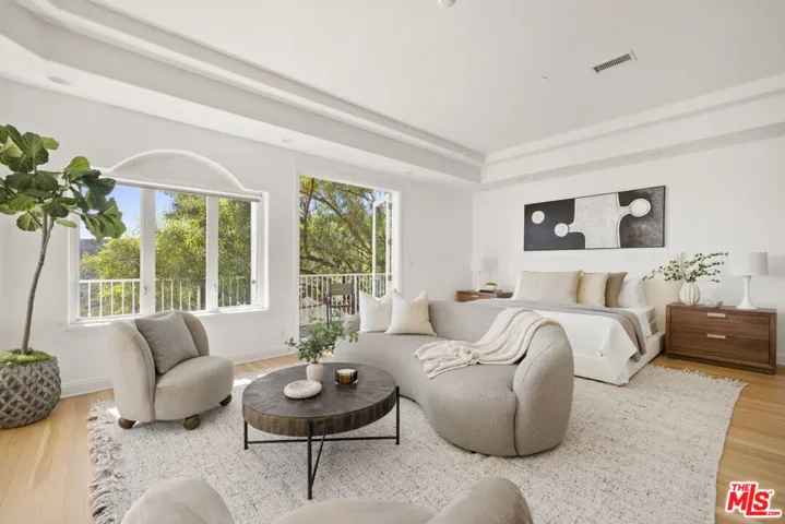 Back on the market at an unmatched price per square foot. This thoughtfully designed residence combines clean, modern architecture with exceptional scale and natural light throughout. Ideal for art collectors and entertainers alike, the home features expansive walls, soaring ceilings, and skylights that illuminate its open layout. The main level offers formal living and dining rooms, a large entertainment room, and a chef’s kitchen with premium appliances. Six bedrooms include a stunning primary suite with dual spa-style bathrooms and oversized walk-in closets. Two additional en-suite bedrooms on the same level offer both privacy and proximity, perfect for family living. On the lower level, two guest suites- each with its own living area and kitchenette- provide comfort and flexibility for extended stays or multigenerational living. Additional amenities include a library, gym, auna, custom built-ins, wine storage, and multiple wet bars. French doors open to private balconies with sweeping canyon, city, and ocean views, while the backyard offers a pool and spa designed for entertaining. Located in one of Bel Air’s most prestigious neighborhoods, this home delivers extraordinary space, luxury, and lifestyle. Agent is related to ownership.