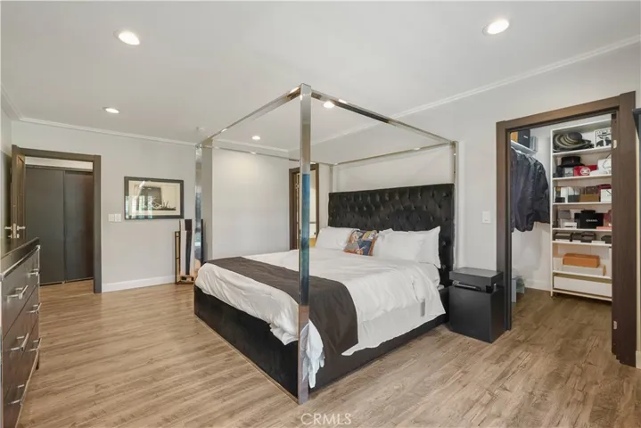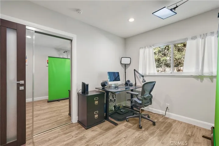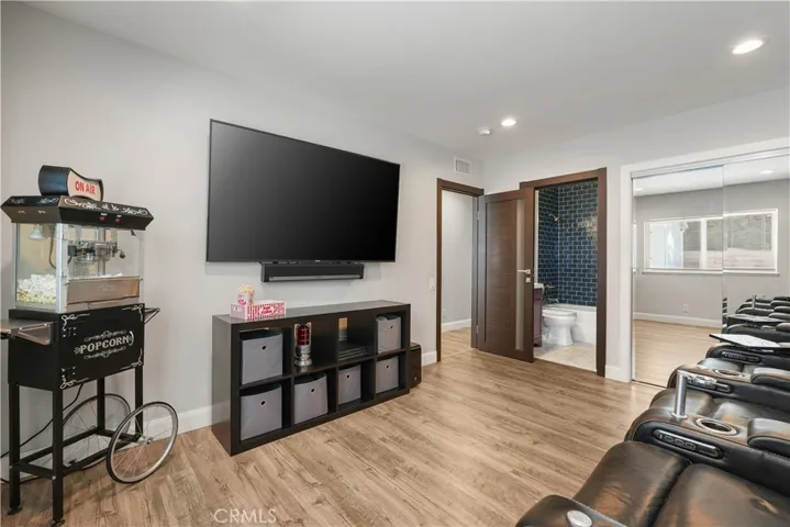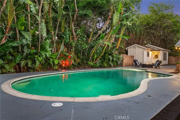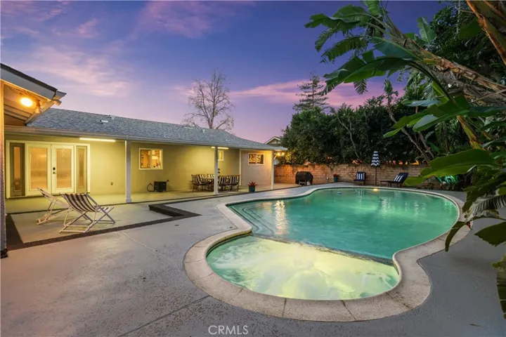 Inspired by mid-century modern design—large windows, abundant natural light, and effortless open spaces—this refined Northridge residence offers elevated living on a quiet cul-de-sac. Set on an expansive 11,000+ sq ft lot, the home features an inviting curb presence with manicured front landscaping, water feature, and double door entry. With 2,821 sq ft of thoughtfully remodeled interior space, this 6-bedroom, 4.5-bath home showcases clean modern lines and upgraded finishes throughout. A stylish entryway flows effortlessly into the spacious open living area bathed in natural light pouring in from the wall of windows. Architectural design elements excite with elegant Venetian Plaster-like finish on accent walls, similar finish on mixed media room divider, sleek modern fireplace, and slim-lined air vents. Double French doors with additional side panels extend the living space outdoors to the private backyard retreat with lush greenery, pool, spa, and fire pit. The updated kitchen blends striking contrast and harmonious design, featuring an oversized island crowned with a designer range hood, a peninsula breakfast bar, two-tone cabinetry edged with white quartz countertops offering abundant counter space and set off by black glass tile backsplash, stainless steel convection double ovens, and a large four-compartment black refrigerator. The luxury primary suite offers exceptional comfort and style with generous windows, a walk-in closet, and a spacious updated bath with textured tile walls, glass-topped dual vanity, large walk-in shower, separate soaking tub, and a privacy window bringing in soft natural light. Additional bathrooms have also been beautifully upgraded. A guest bedroom and bath are located on the opposite side of the home for ideal privacy. Additional features include: luxury vinyl flooring throughout the main living areas, newer windows, newer roof, Tesla super charger, keyless entry, upgraded pool equipment, recessed lighting, solid modern interior doors with glass panel insets and elegant hardware. Also included is bonus structure currently used as a music studio with attached storage. With its own A/C, this is an ideal space for creative, work-from-home, or recreational needs. Highly regarded charter schools Topeka, Nobel, and Granada High serve this special neighborhood.