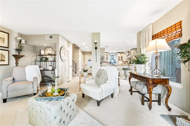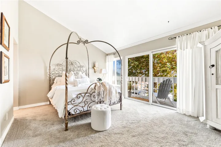 Enter from your two-car garage or the gated courtyard to a relaxing patio and once inside you will immediately feel the care and attention to detail put into this home with expansive high ceilings and exquisite upgrades including flooring, custom patterned carpet, dual pane windows, custom woven wood shades. Kitchen features custom high-end cabinetry with spindle details and glass-front doors, creating a warm and inviting atmosphere. Kitchen offers a perfect balance of elegance, comfort, and functionality. Upstairs you will find a generously sized bedroom and remodeled hall bathroom with bathtub. Down the hall is the oversized primary bedroom featuring a balcony with views, vaulted ceiling, two generous sized closets and a remodeled bathroom with a claw-foot tub and ample storage.