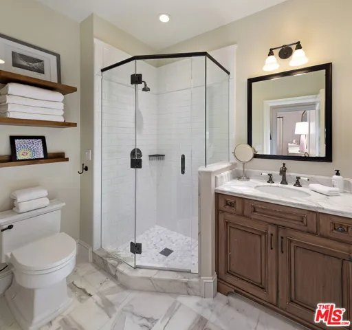 Luxe, recently updated, 4-bed, 4.5-bath single-level estate blends classic elegance with Ralph Lauren-inspired sophistication in Montecito’s coveted Cold Spring School district. Exceptional craftsmanship is evident at every turn, from the exquisite millwork to the honed marble kitchen and baths, modern lighting, and French doors all contributing to a home that offers a truly welcoming retreat. The handsome family room impresses with vaulted ceilings, custom built-ins, and an open flow to the gourmet kitchen, where an oversized island, fantastic appliances, and coffered ceiling create a chef’s dream. The formal living room, featuring a marble fireplace and window seat overlooking the pool, spa, and manicured gardens, complements the adjacent formal dining room, private office, and versatile attached garage/media room, enhancing livability. The primary suite boasts a spa-like ensuite bath, walk-in closet, ample storage, French doors, and vaulted ceilings. Nestled behind double gates, the private grounds offer stone terraces, lush lawns, a sparkling pool, built-in outdoor kitchen, vibrant hydrangeas, and a stately tree-lined motor court. Quintessentially Montecito, this nearly 3,900-square-foot residence offers effortless luxury and refined comfort. It is within easy reach of both Lower and Upper Villages.