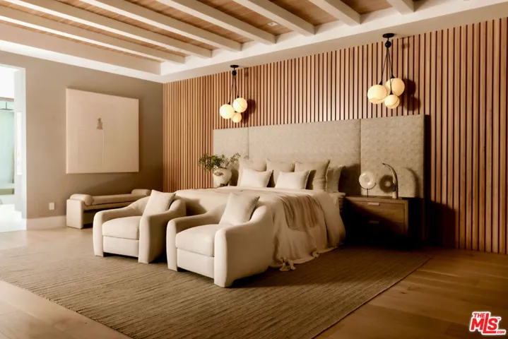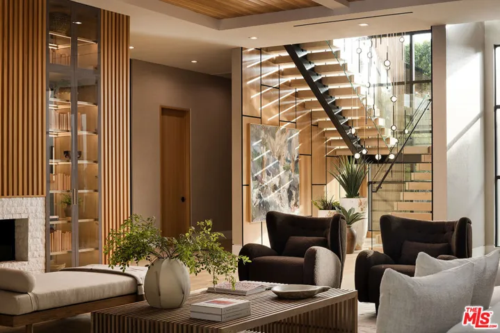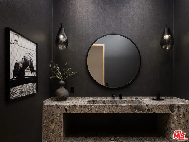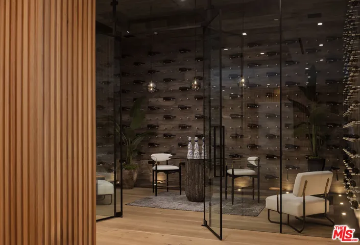 Indulge in an effortless resort-quality lifestyle from this extremely private entertainer’s compound surrounded by natural greenery with sumptuous canyon views, showcasing a variety of premier amenities on 1.3 acres of mostly flat usable land. An absolute dream for recreational enthusiasts, growing families, and sports professionals alike, this exquisite haven includes a dedicated pickleball court, a professional-size basketball/sports court, and putting green, all enveloped by a flourishing leafy paradise. An expansive gated motor court provides parking for ten cars, and a striking entry calms the senses with soft organic tones complementing the lush hillside beyond. A gourmet chef’s kitchen is outfitted with bookmatched stone slabs, triple waterfall island, and Miele appliances as well as a commercial-grade walk-in refrigerator in the caterer’s prep galley. Both bar and wine room are showpiece standouts, and the theatre is expertly configured to match a true cinema experience. Upstairs, the primary wing alone spans 3,000 square feet and offers a lounge, two-sided fireplace, and a marvelous spa-worthy imported European stone-clad bathroom plus dual closet changing rooms, one of which features a walk-out balcony with fire pit overlooking the grounds below. Other amenities include an office, gym, sauna, and mud room. Enjoy a casual, fun-filled lifestyle at this private, family-friendly luxury resort that features a cabana with outdoor kitchen and rainfall curtain, relaxation loggia, a 16-person sunken fire pit with glass view to pool, numerous sitting areas, organic gardens, and 3,000-square-foot rooftop deck optimized for entertaining under California skies. Secluded in a park-like setting with no immediate neighbors, this ideal estate promises joyful existence and enduring, uninterrupted leisure from one of the most highly sought-after locales in the world. Welcome to the peak of contemporary luxury.