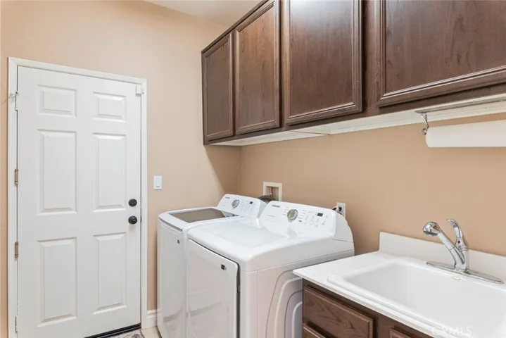 The kitchen is well-appointed with granite countertops, custom cabinetry, recessed lighting, a center island with additional storage, and a walk-in pantry. It opens to a casual dining area with direct access to the backyard. The family room features a gas-starting wood-burning fireplace, built-in cabinetry, and a ceiling fan. A dedicated laundry room with cabinetry, utility sink, and direct garage access completes the main floor.