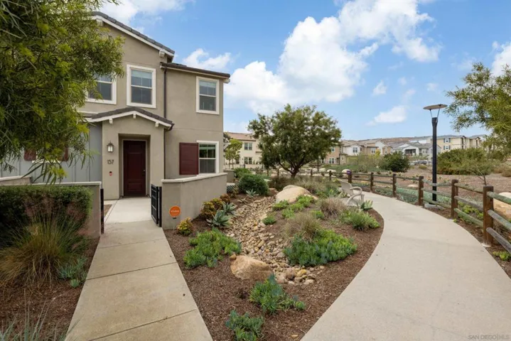 Experience life in the Village of Escaya. Positioned in one of the community’s most desirable locations this corner townhome offers panoramic canyon and trail views along with rare privacy and no homes in front. Natural light fills the home and unobstructed eastern exposure delivers stunning sunrises. The open floor plan includes a spacious great room a family room upstairs and well sized bedrooms including a primary suite with a generous bathroom and walk in closet. This home has been very well maintained and thoughtfully upgraded with modern lighting 18 leased solar panels an EV charging station and a tankless water heater. Residents enjoy resort style amenities including a pool gym clubhouse parks trails and a new school. The nearby village center offers shops and restaurants providing the perfect blend of convenience and modern living.