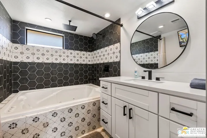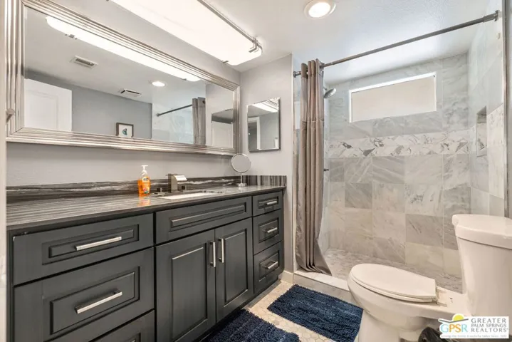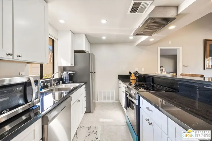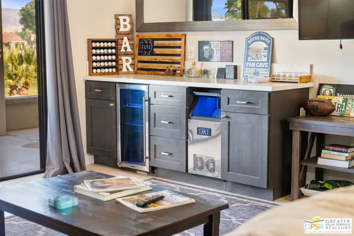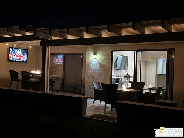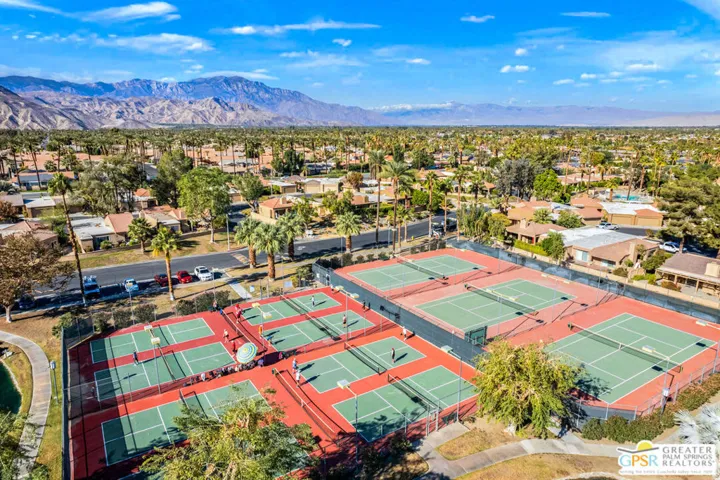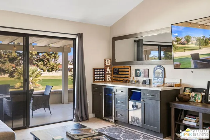 Introducing this highly sought-after Vintage Model Plan, perfectly situated inside the gates of Palm Desert Resort CC and overlooking the 15th fairway with spectacular golf course and mountain views. Inside, you’ll find an inviting open-concept floor plan centered around a newly remodeled kitchen featuring expansive granite countertops with barstool seating, abundant cabinetry, and new appliances (2025). The thoughtful layout places the owner’s suite and bath on one side of the home, with the guest bedroom and bath on the oppositeideal for privacy and making this one of the community’s most desirable floor plans. The living room is an entertainer’s delight, complete with a custom bar, beverage refrigerator, ice maker, and additional storage. Both bathrooms have been beautifully updated, with the primary suite boasting a luxurious two-person jetted tub. An expanded indoor laundry room adds everyday convenience. Relax and unwind on the extended back patio, complete with a patio awning, outdoor dining area that seats six, fire pit, and even an outdoor freezerperfect for al fresco entertaining while enjoying the fairway and mountain panorama. The home is offered turnkey furnished for immediate enjoyment! Palm Desert Resort CC offers an 18-hole championship golf course, a newly renovated clubhouse, 20 pools and spas, and the Coachella Valley’s premier pickleball and tennis club, making this a perfect primary residence, second home, or vacation rental.