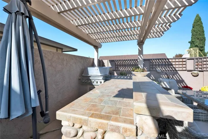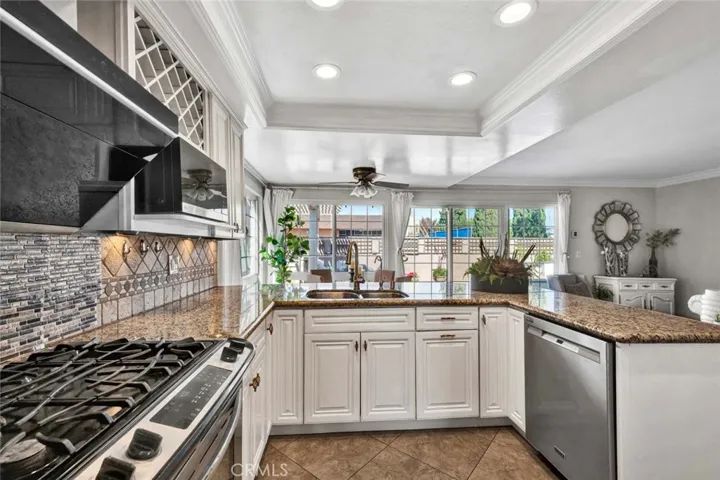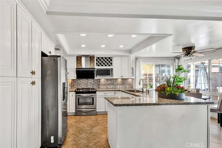 Welcome to this absolutely stunning, exceptionally rare Cypress pool home—the largest Pacesetter model, offering 5 bedrooms, 4 bathrooms, and approximately 2,800 square feet of upgraded living space. Ideal for multi-generational living, this floorplan features 3 bedrooms (including the spacious primary suite) and 2 baths downstairs, while the upper level boasts a versatile loft/den with balcony, two large bedrooms each with retreat areas and one with a walk-in closet, and two additional bathrooms. Double entry doors open to a dramatic foyer with soaring two-story ceilings and elegant tile flooring, introducing a home filled with style and comfort, including central A/C, abundant natural light from oversized dual pane windows, plantation shutters, raised-panel doors, crown molding, recessed lighting, ceiling fans, wood laminate and tile flooring, and a staircase with wrought-iron railings and handcrafted wood banisters. The formal living room flows seamlessly to the adjacent dining room, while the remodeled chef’s kitchen impresses with granite countertops, Travertine backsplash, coffered ceiling, stainless appliances, custom soft-closing cabinetry with glass display panels, wine storage, microwave niche, and hidden recycle trash, plus a breakfast bar open to both the sunny breakfast nook and inviting family room. French sliders lead to your private backyard resort oasis, with its sparkling pool featuring a Baja shelf, a river-rock outdoor kitchen and built-in BBQ with bar seating beneath a charming pergola, and beautifully accented hardscape, framed by an extra-tall stucco privacy fence. Every bathroom has been tastefully upgraded with designer tile and custom vanities, completing this truly exceptional and one-of-a-kind Cypress home. Located inside a highly sought-after neighborhood and just steps to top-rated Vessels Elementary and close to Cypress High, stores, and restaurants.