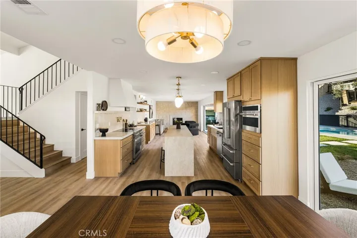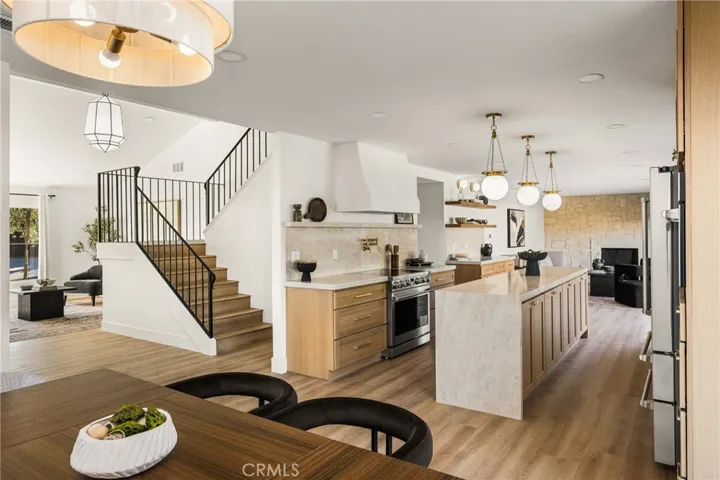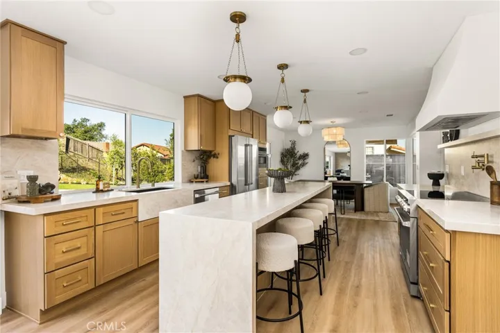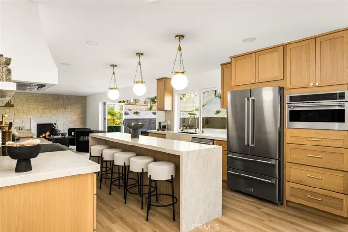 Soaring 15-ft ceilings and an open architectural layout fill the home with natural light. At the center of the design is a showpiece kitchen with warm oak cabinetry, quartz countertops, an oversized island, and a full Thor appliance suite—perfectly positioned as the home’s versatile gathering hub.